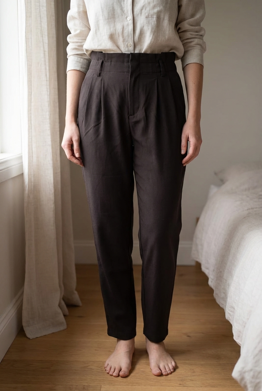 Pantalon droit de pie, mirando a la cámara, en un dormitorio con luz suave y natural filtrándose por la ventana.