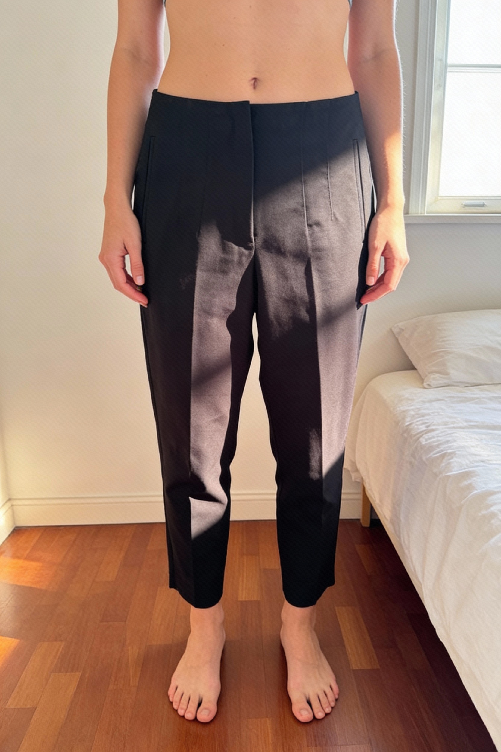 Una persona in Pantalon droit noir femme 40 - pantalone dritto Nero donna in piedi, rivolto verso la fotocamera, in una camera da letto con luce soffusa e luce naturale che filtra dalla finestra.