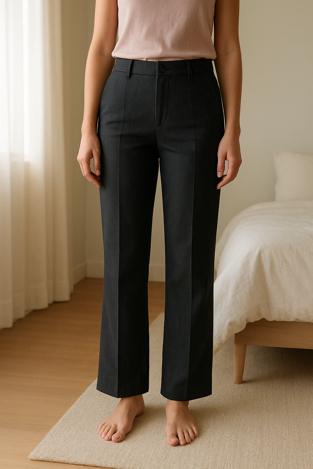 Pantalon femme eden park gris debout, face à la caméra, dans une chambre à la lumière douce, avec une lumière naturelle filtrant par la fenêtre.