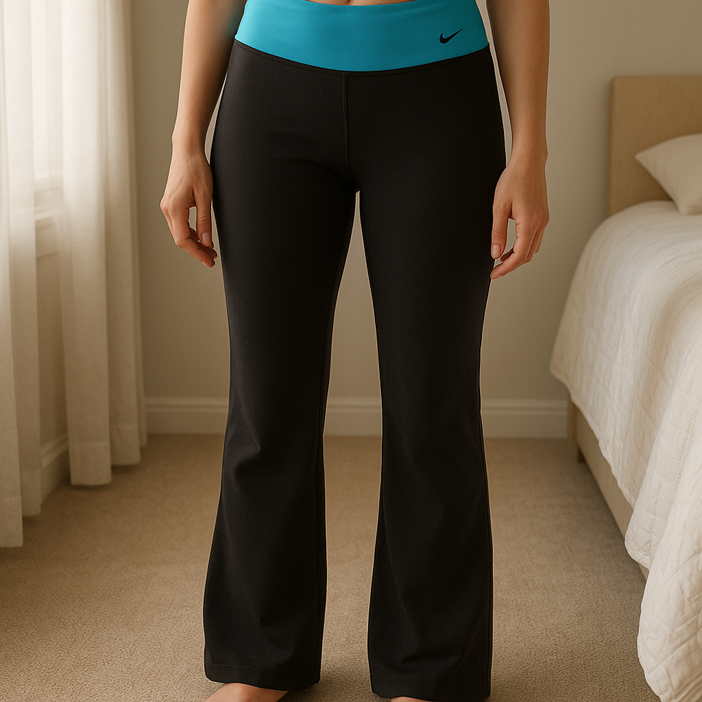 Pantalon femme jambes évasées Nike L - pantaloni Nike in piedi, rivolto verso la fotocamera, in una camera da letto con luce soffusa e luce naturale che filtra dalla finestra.