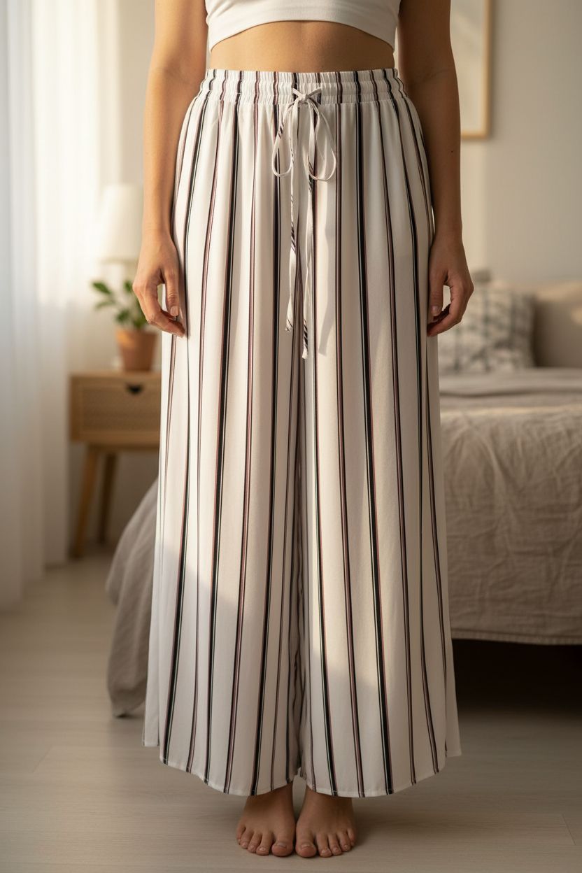 Une personne en Pantalon fluide jambes larges debout, face à la caméra, avec une silhouette légèrement plus ronde, dans une chambre à la lumière douce, avec une lumière naturelle filtrant par la fenêtre.