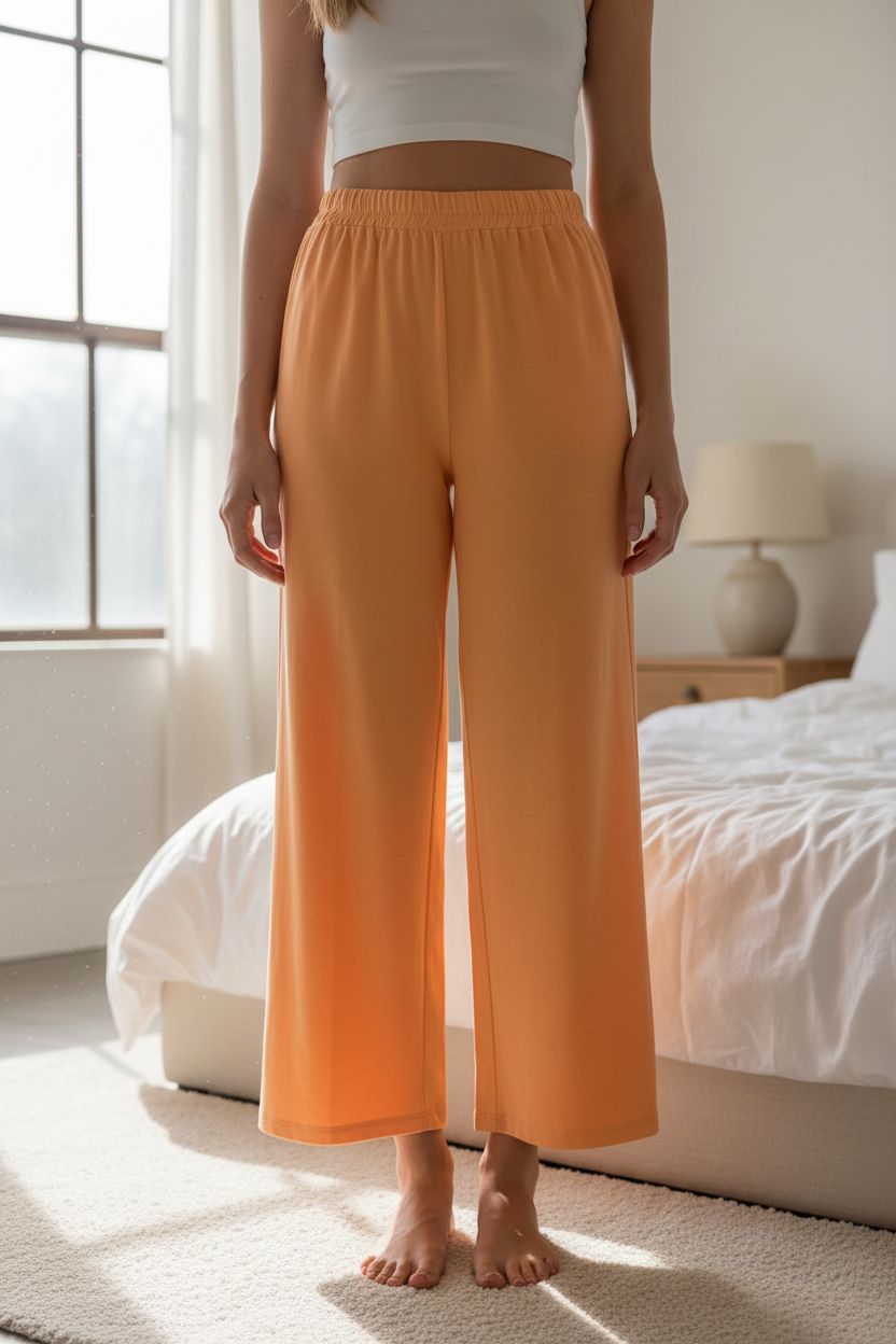 🧡 Pantalon fluide Musera orange pêche debout, face à la caméra, dans une chambre à la lumière douce, avec une lumière naturelle filtrant par la fenêtre.