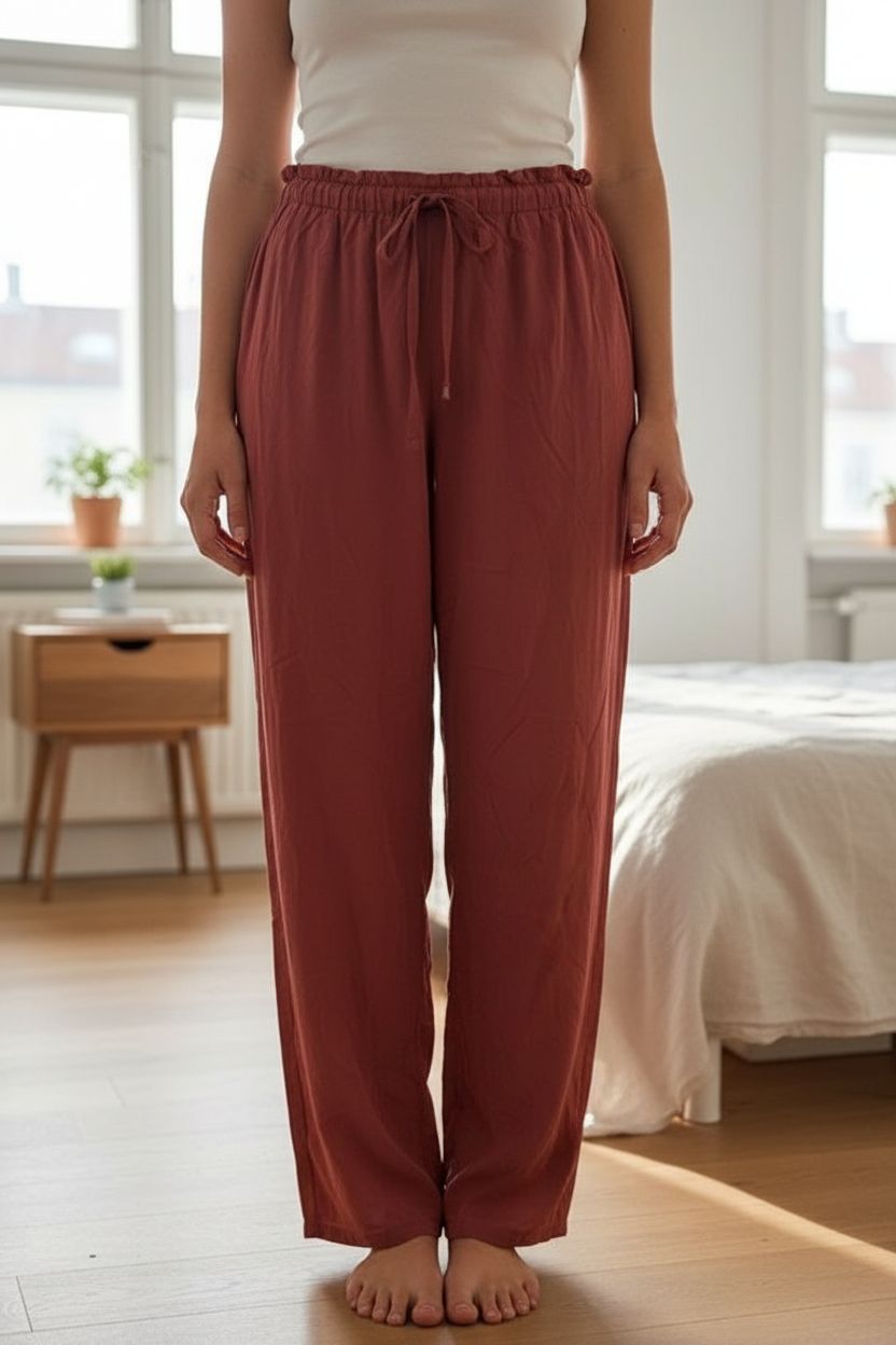 Pantalon fluide terracotta 40 - Pantalone a gamba ampia estate in piedi, rivolto verso la fotocamera, in una camera da letto con luce soffusa e luce naturale che filtra dalla finestra.