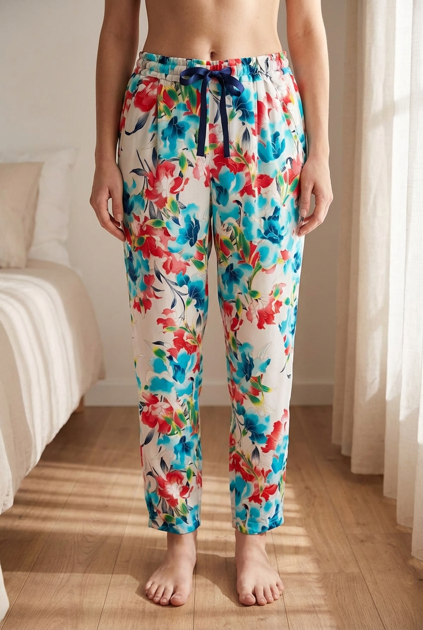 Une personne en Pantalon fluide Zara debout, face à la caméra, dans une chambre à la lumière douce, avec une lumière naturelle filtrant par la fenêtre.