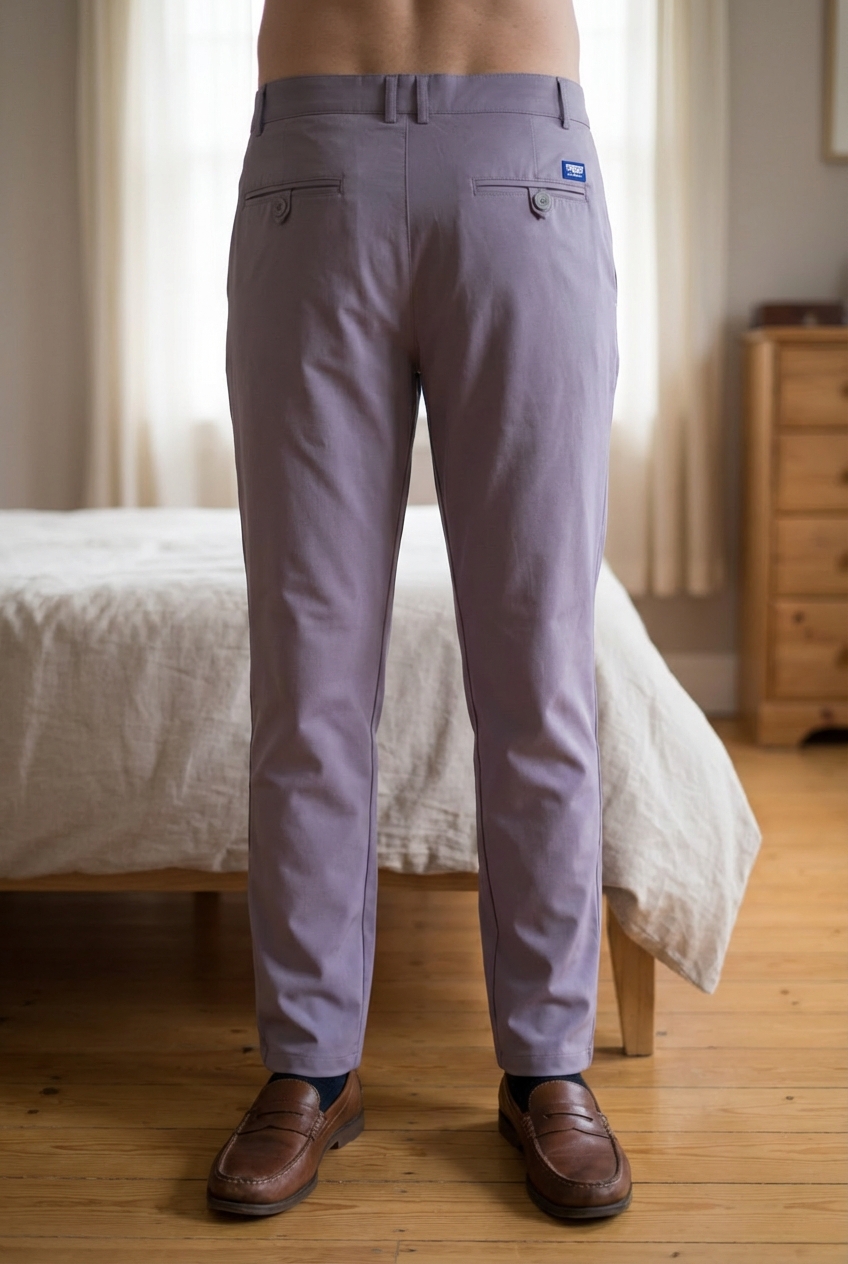 Pantalon - Golf - PGM debout, face à la caméra, dans une chambre à la lumière douce, avec une lumière naturelle filtrant par la fenêtre.