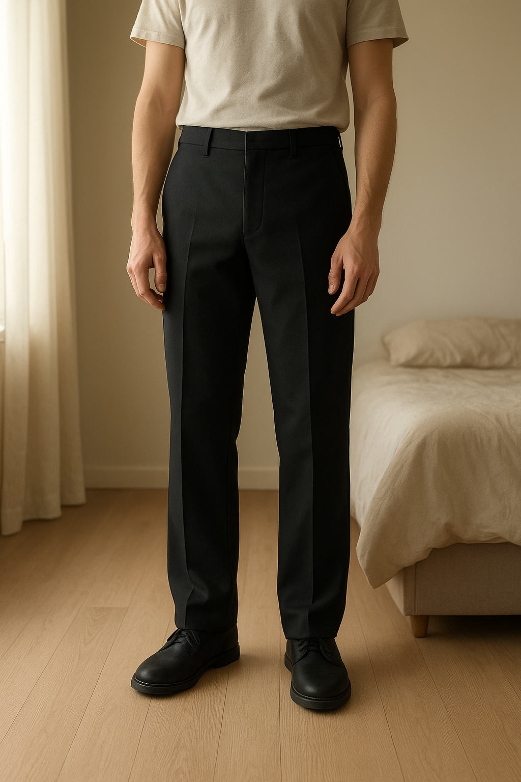 Pantalon Golf Playboy debout, face à la caméra, dans une chambre à la lumière douce, avec une lumière naturelle filtrant par la fenêtre.