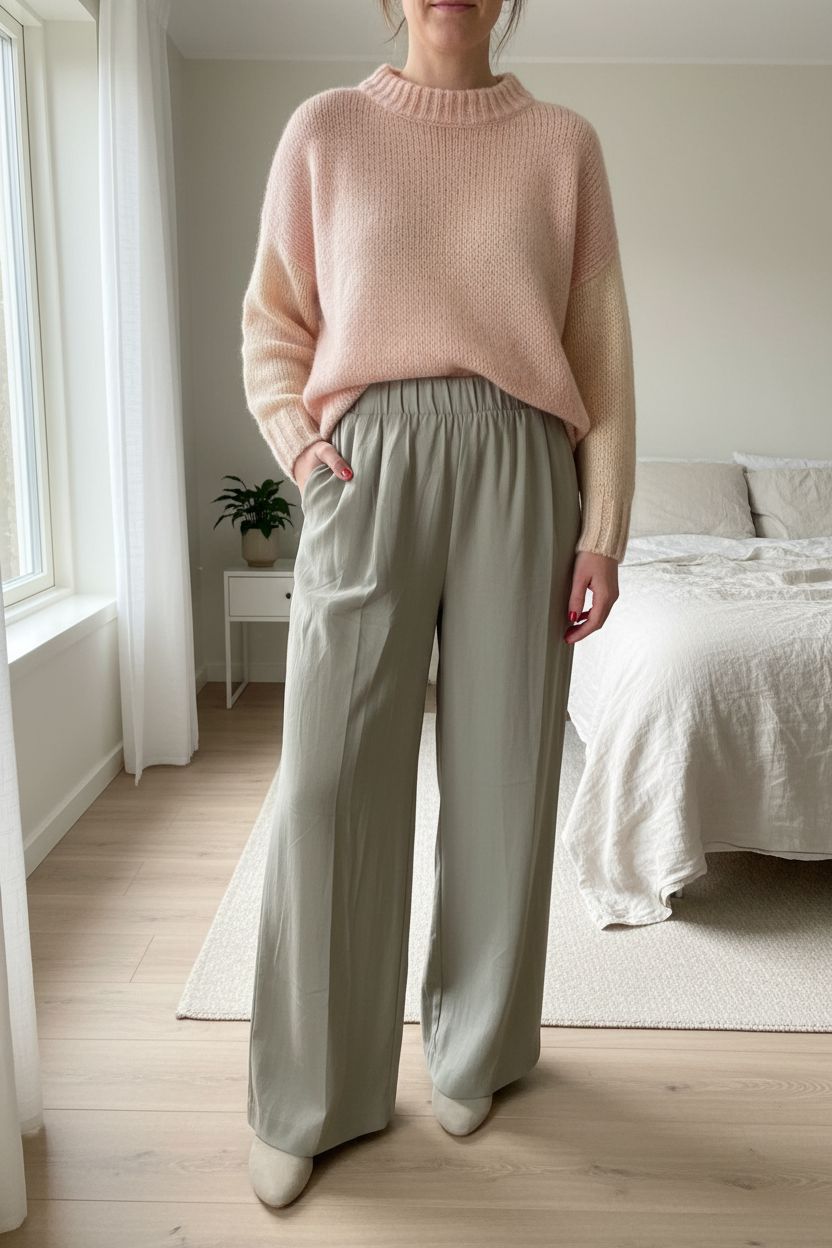 Pantalon Grâce & Mila debout, face à la caméra, dans une chambre à la lumière douce, avec une lumière naturelle filtrant par la fenêtre.