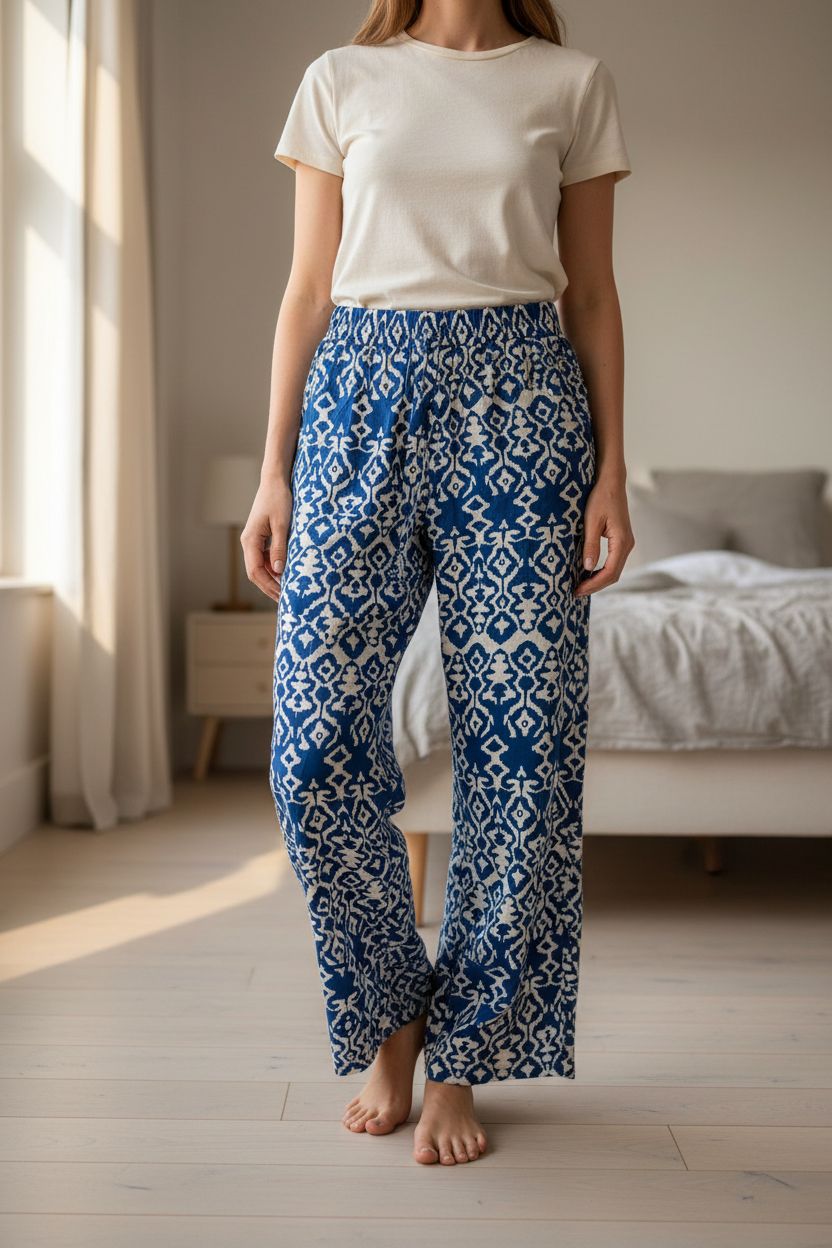 Pantalon jambe larges fluide à motifs M - Pantaloni a gamba ampia in piedi, rivolto verso la fotocamera, in una camera da letto con luce soffusa e luce naturale che filtra dalla finestra.