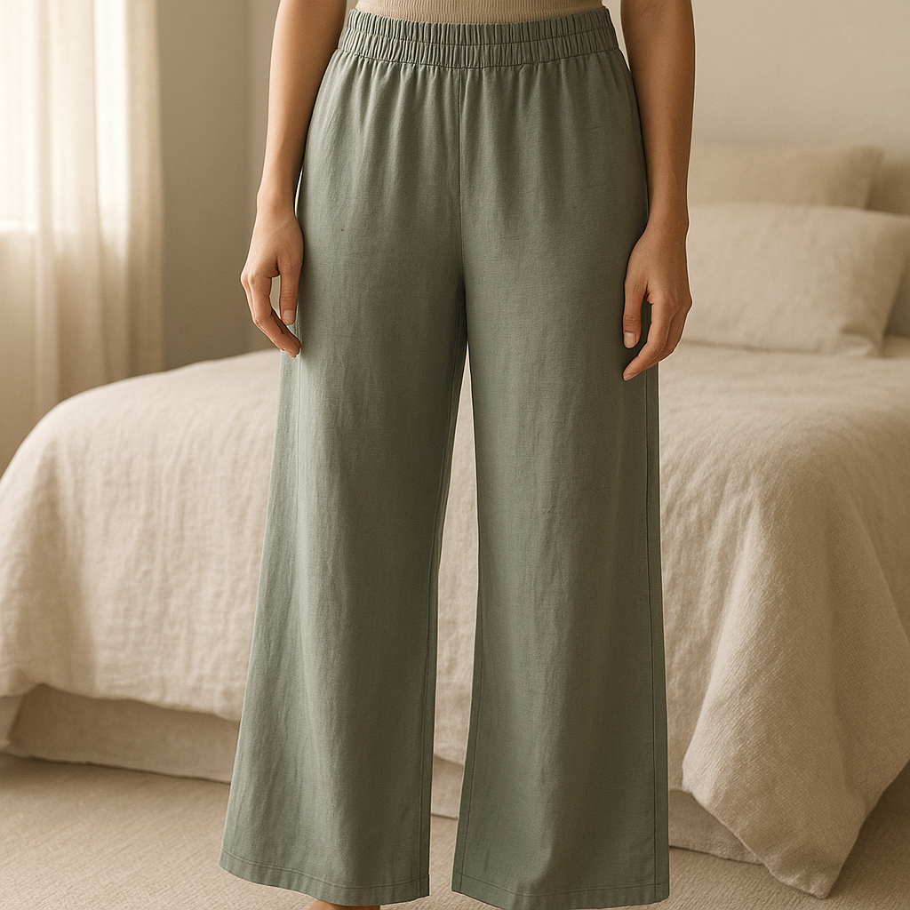 Pantalon jambes larges Zara debout, face à la caméra, dans une chambre à la lumière douce, avec une lumière naturelle filtrant par la fenêtre.