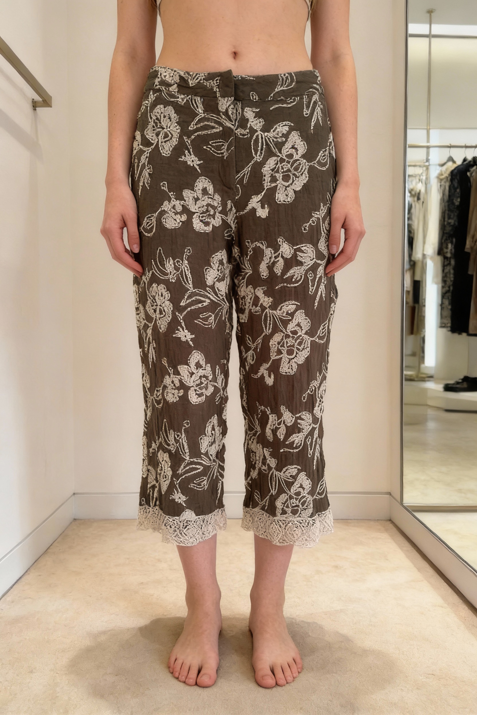 Una persona in Pantalon large à motifs Zara M - pantalone Zara donna M in piedi, rivolto verso la fotocamera, in un camerino in stile boutique con specchio e decorazioni neutre.