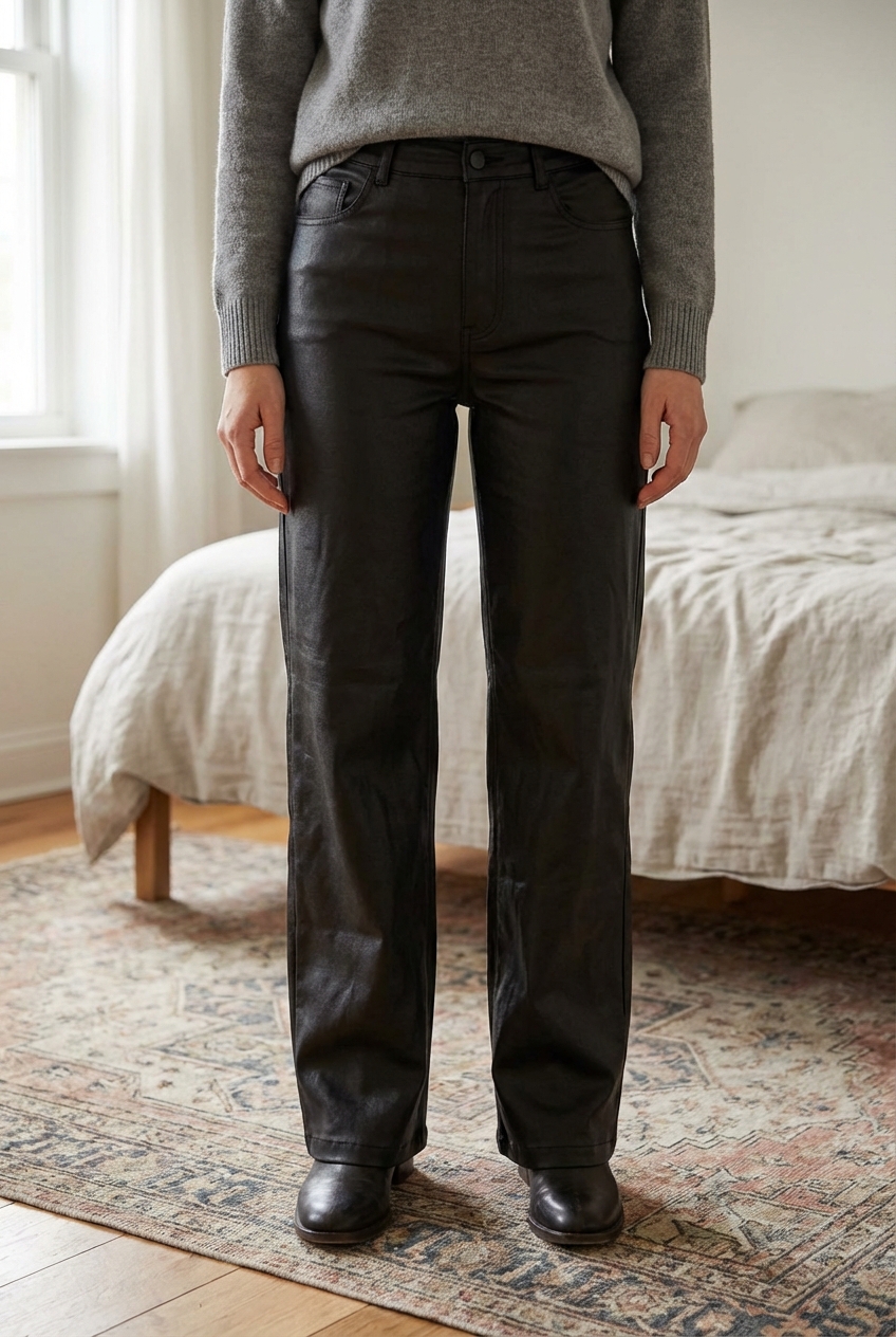 🖤 Pantalon Shein noir effet cuir debout, face à la caméra, dans une chambre à la lumière douce, avec une lumière naturelle filtrant par la fenêtre.