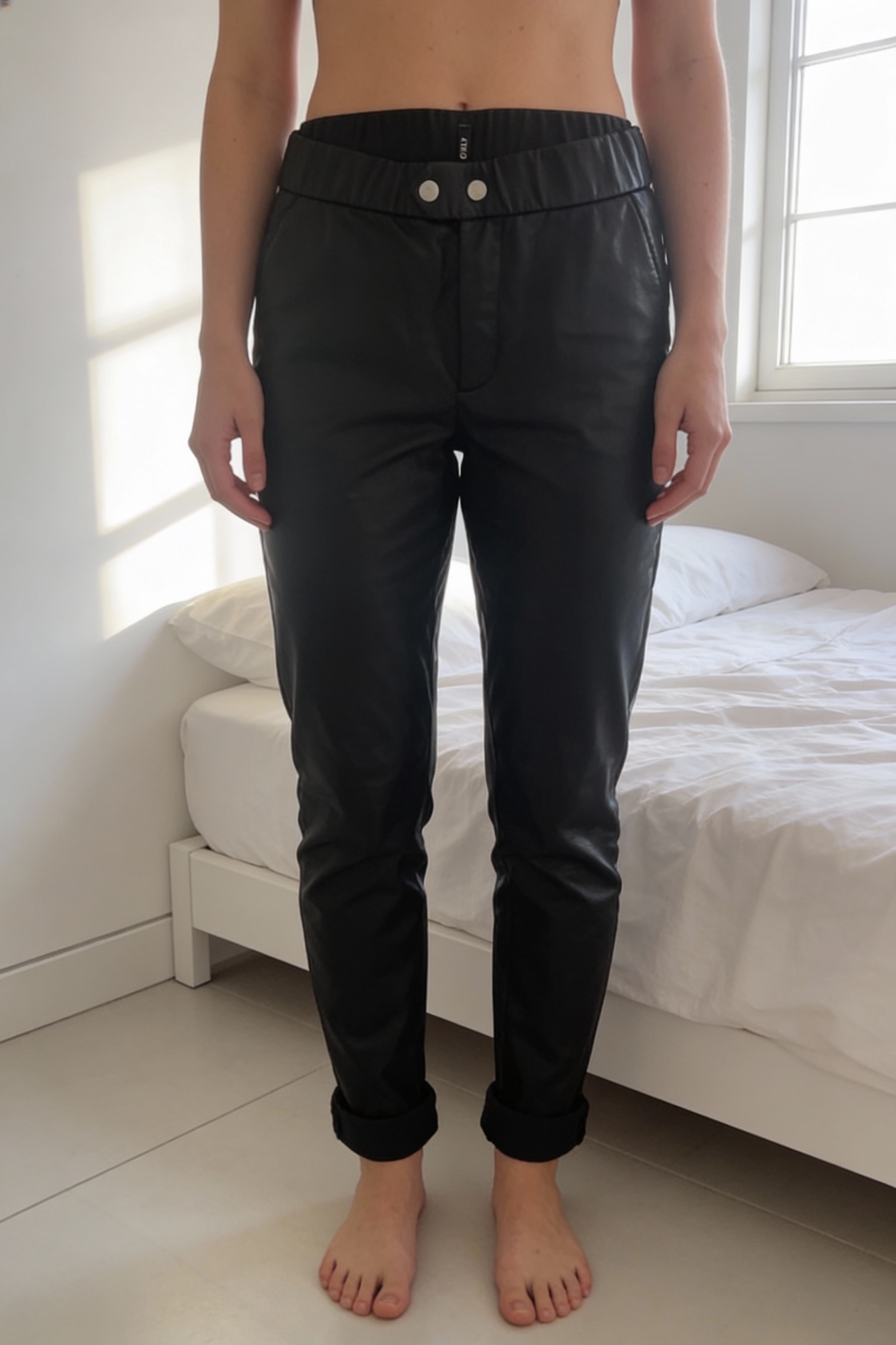 Pantalon simili cuir Only M debout, face à la caméra, dans une chambre à la lumière douce, avec une lumière naturelle filtrant par la fenêtre.