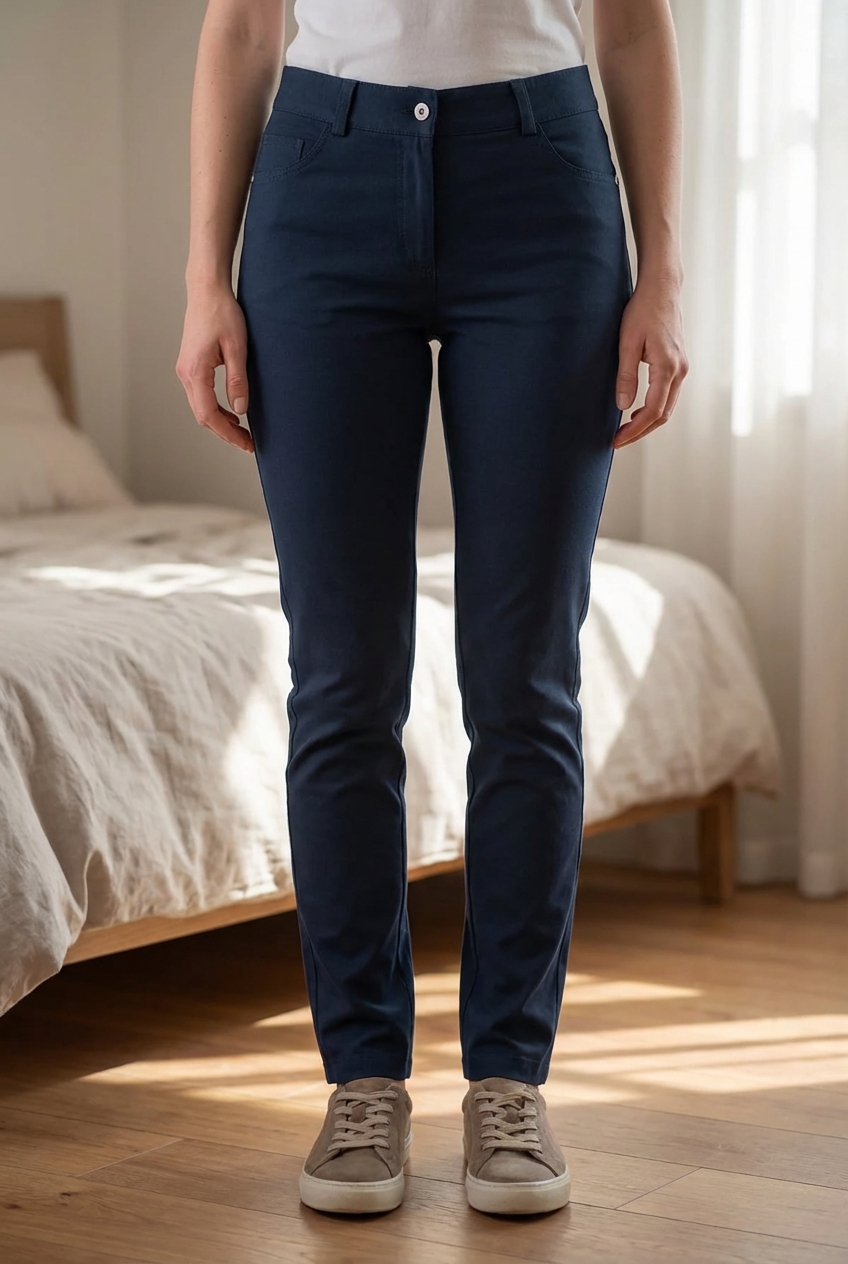 Una persona in Pantalon skinny bleu S Pantaloni blu Donna S in piedi, rivolto verso la fotocamera, in una camera da letto con luce soffusa e luce naturale che filtra dalla finestra.