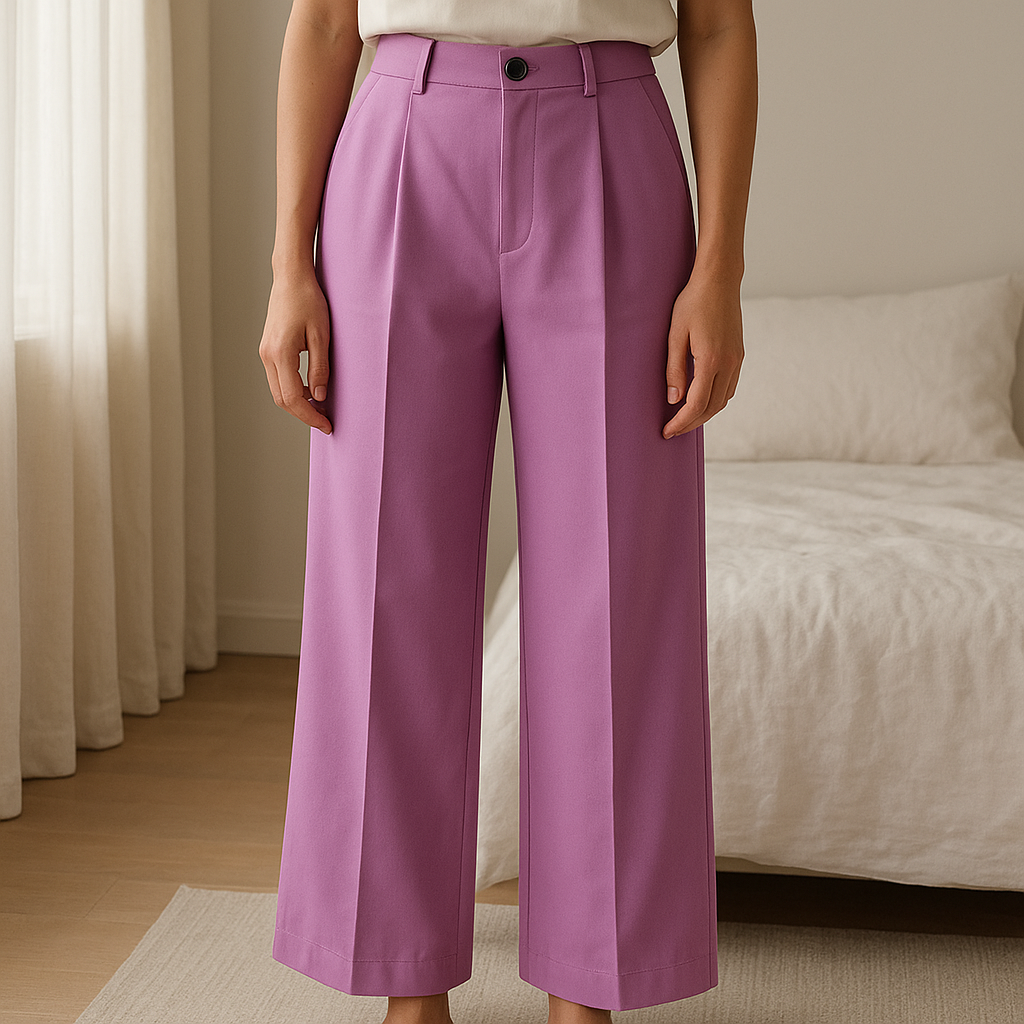 pantalon violet debout, face à la caméra, dans une chambre à la lumière douce, avec une lumière naturelle filtrant par la fenêtre.