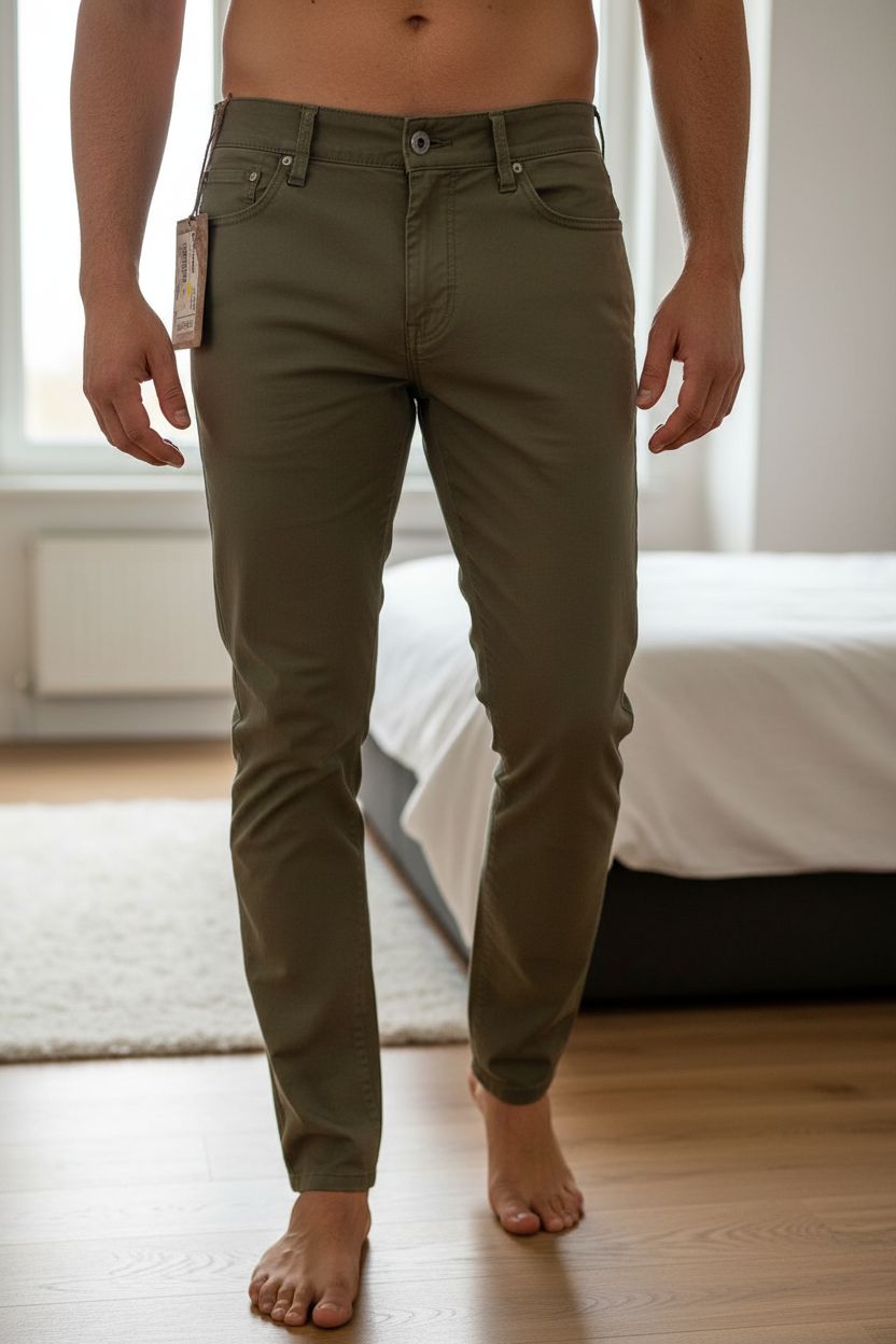 pantalone cachi nuovo in piedi, rivolto verso la fotocamera, in una camera da letto con luce soffusa e luce naturale che filtra dalla finestra.
