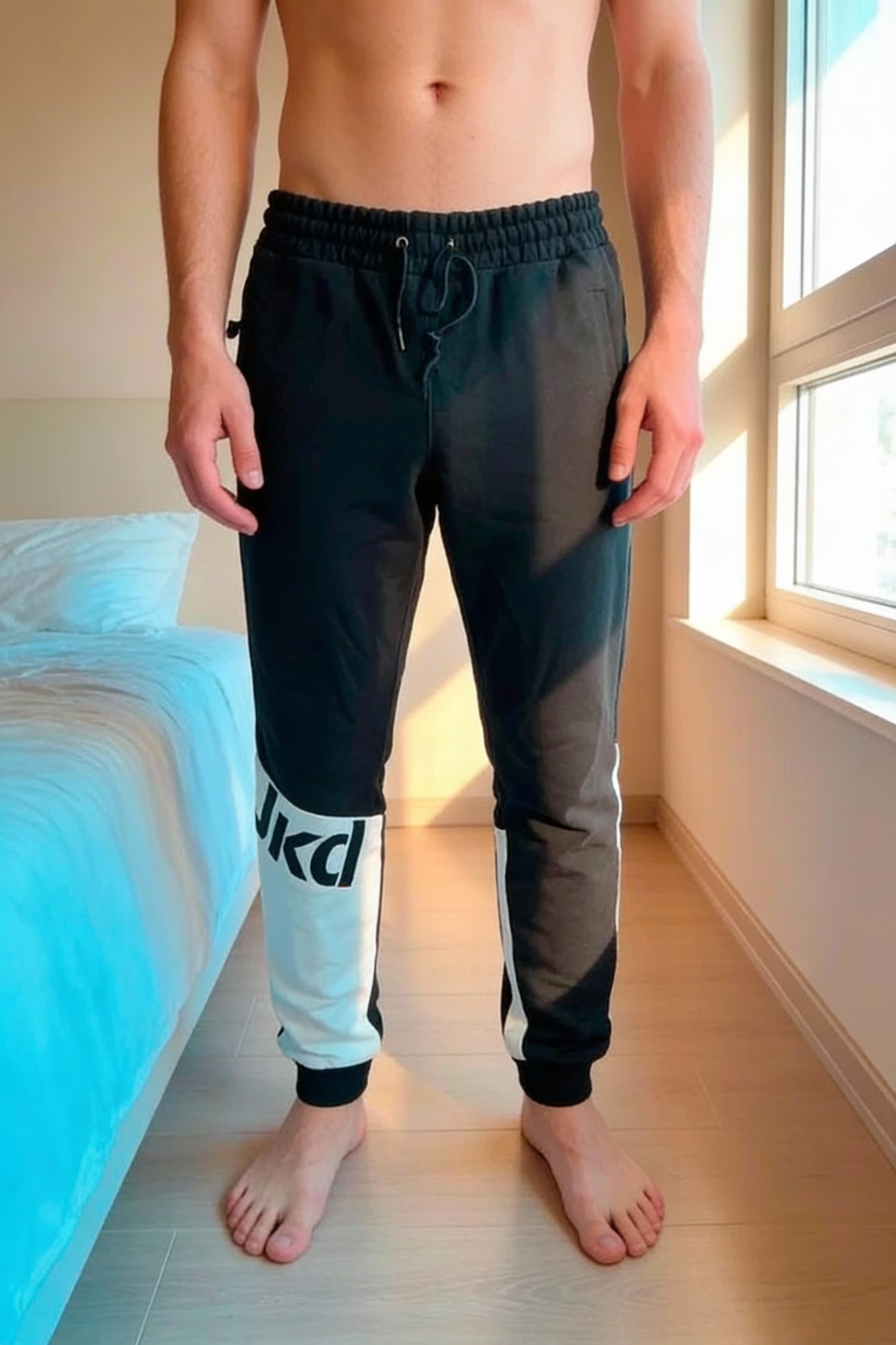Pantalone di Tuta Bianco e Nero in piedi, rivolto verso la fotocamera, in una camera da letto con luce soffusa e luce naturale che filtra dalla finestra.