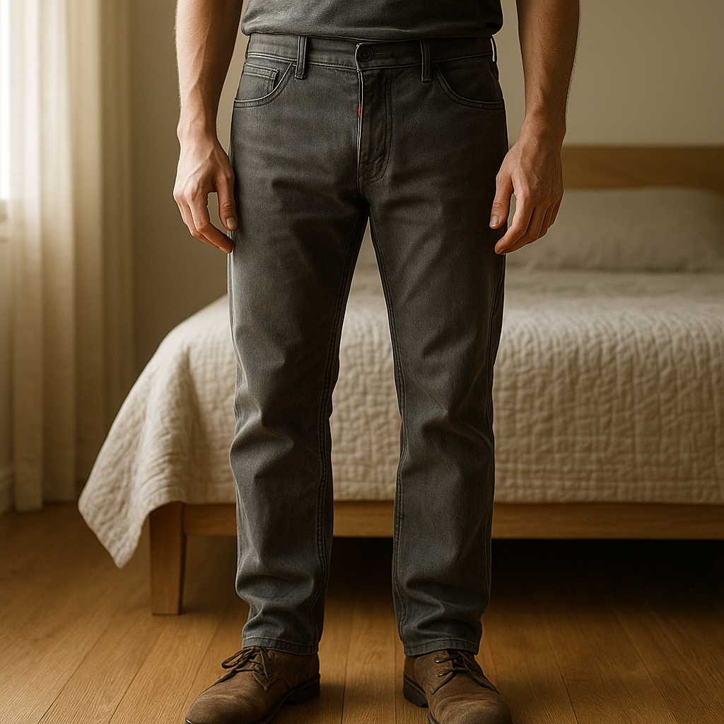 Pantalone “Rodeo” Dsquared in piedi, rivolto verso la fotocamera, in una camera da letto con luce soffusa e luce naturale che filtra dalla finestra.