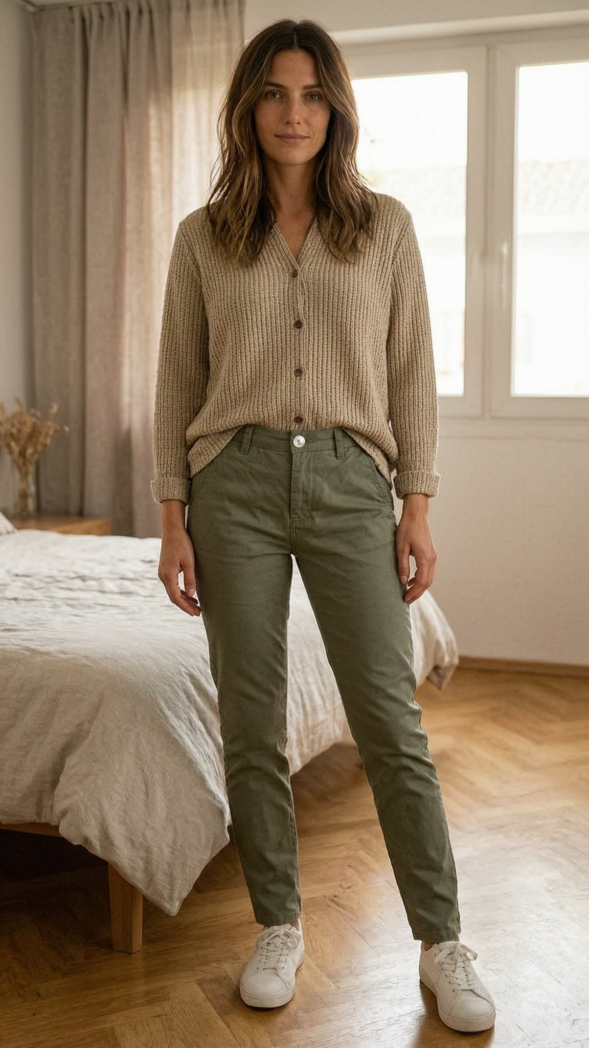 Pantaloni Bershka XXS in piedi, rivolto verso la fotocamera, in una camera da letto con luce soffusa e luce naturale che filtra dalla finestra.