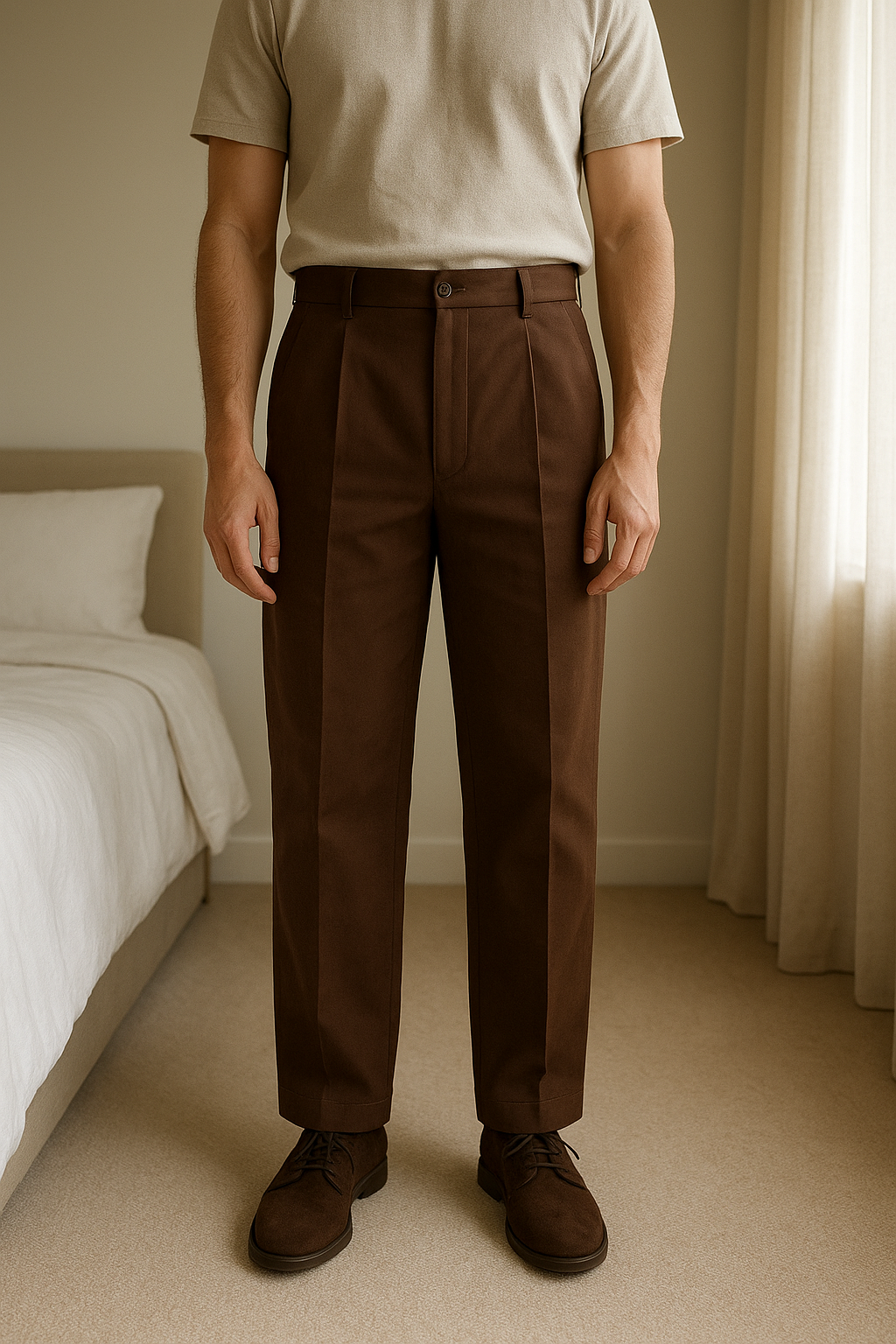 Pantaloni Eleganti Marroni Uomo – Taglia 46, Stile Classico e Raffinato in piedi, rivolto verso la fotocamera, in una camera da letto con luce soffusa e luce naturale che filtra dalla finestra.