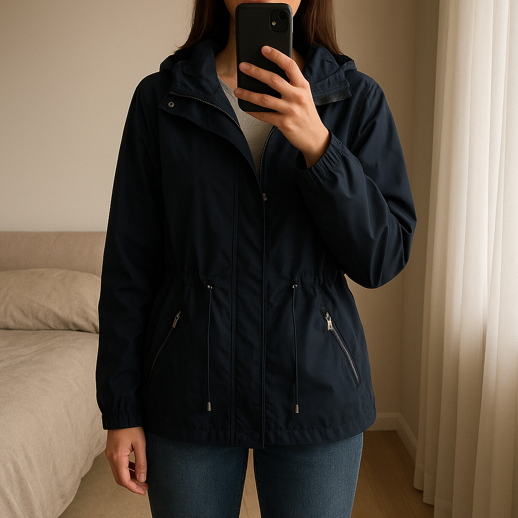 Parka leggero blu -Wampum Donna in piedi, rivolto verso la fotocamera, in una camera da letto con luce soffusa e luce naturale che filtra dalla finestra.