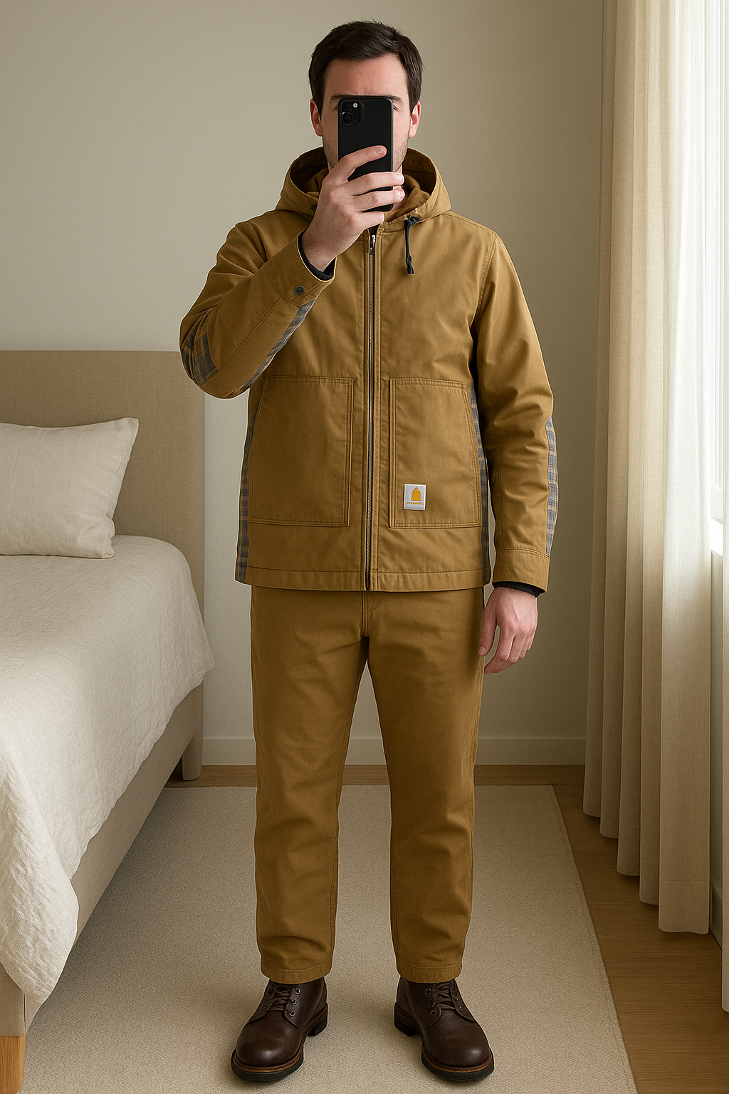 Parka neuve carhartt XLmarron et carreaux debout, face à la caméra, dans une chambre à la lumière douce, avec une lumière naturelle filtrant par la fenêtre.
