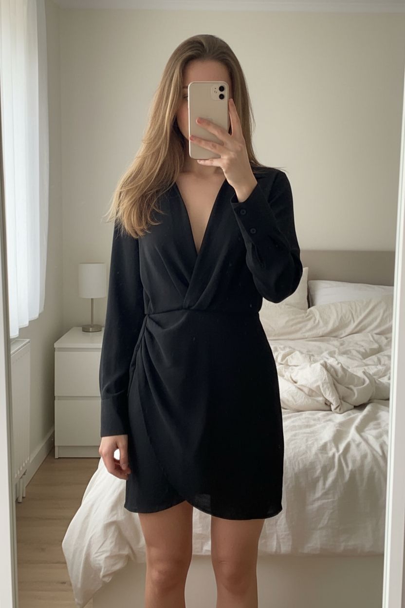 Petite robe noire col chemise matière légère taille 36 debout, face à la caméra, dans une chambre à la lumière douce, avec une lumière naturelle filtrant par la fenêtre.