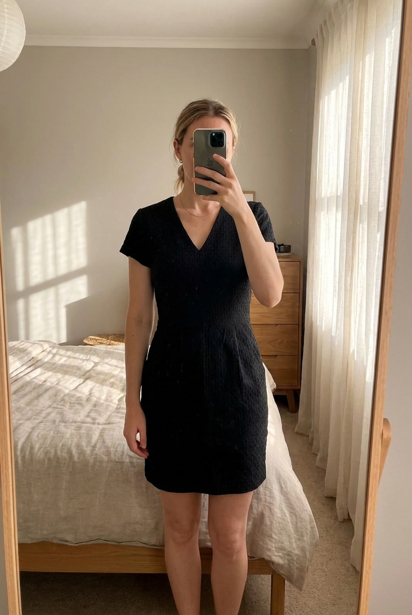 Petite robe noire gaufrée T40 debout, face à la caméra, dans une chambre à la lumière douce, avec une lumière naturelle filtrant par la fenêtre.