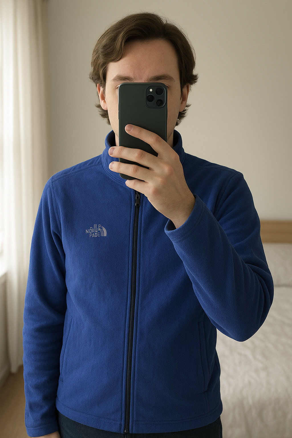 Polaire the north face debout, face à la caméra, dans une chambre à la lumière douce, avec une lumière naturelle filtrant par la fenêtre.