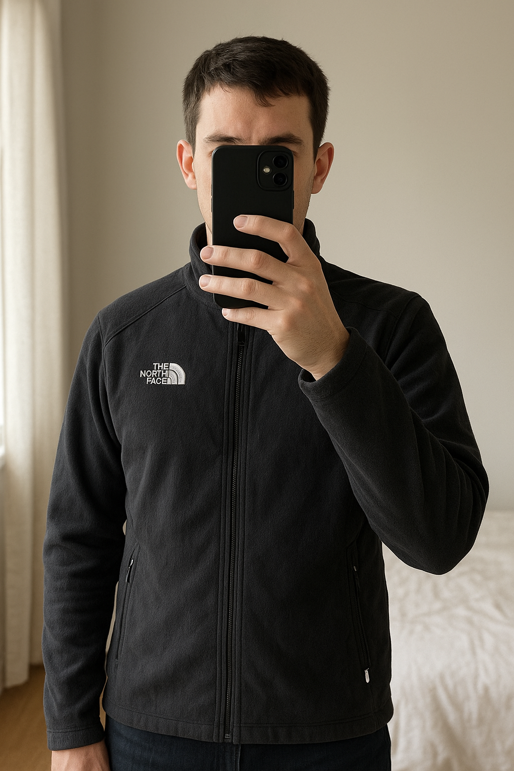 Polaire the north face debout, face à la caméra, dans une chambre à la lumière douce, avec une lumière naturelle filtrant par la fenêtre.