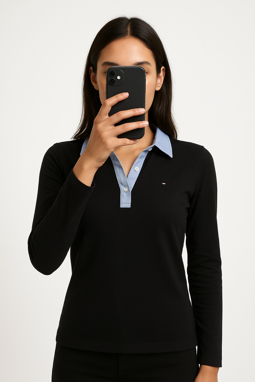 Une personne en Polo femme éden park marine debout, face à la caméra, avec une silhouette fine, dans un studio photo épuré avec fond blanc et éclairage doux.