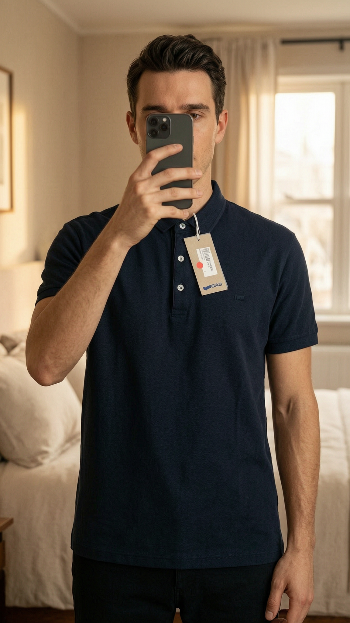 Polo GAS Sodalite Blue Taglia S - Nuova con Cartellino in piedi, rivolto verso la fotocamera, in una camera da letto con luce soffusa e luce naturale che filtra dalla finestra.
