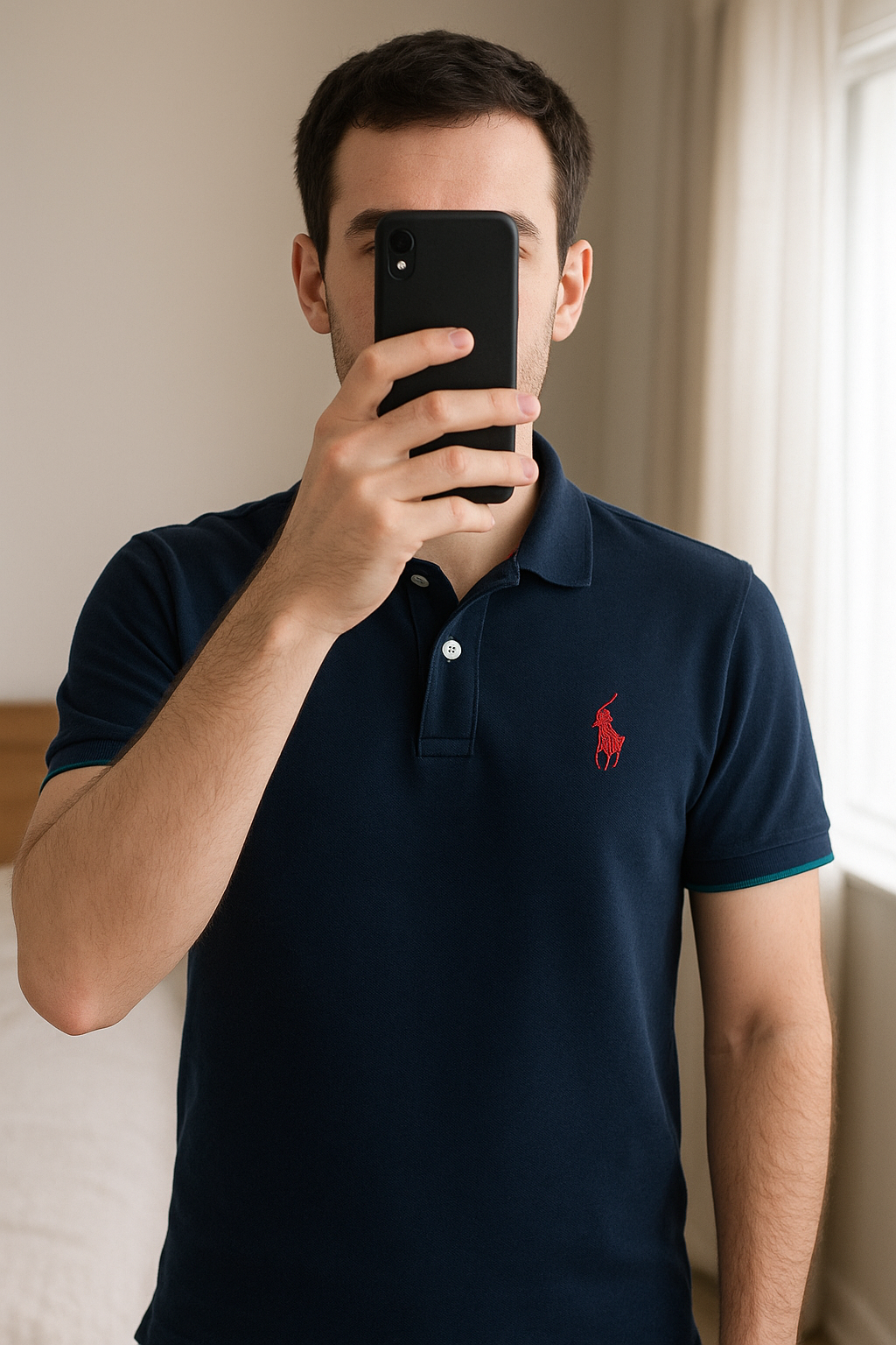 Polo Homme U.S. Polo Assn debout, face à la caméra, dans une chambre à la lumière douce, avec une lumière naturelle filtrant par la fenêtre.