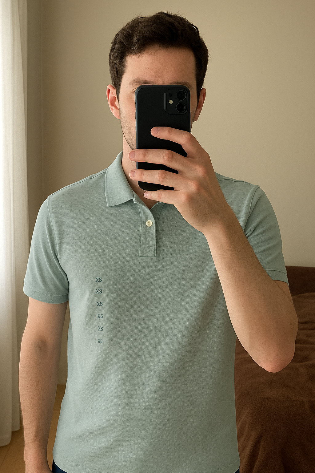 Polo homme XS neuf debout, face à la caméra, dans une chambre à la lumière douce, avec une lumière naturelle filtrant par la fenêtre.