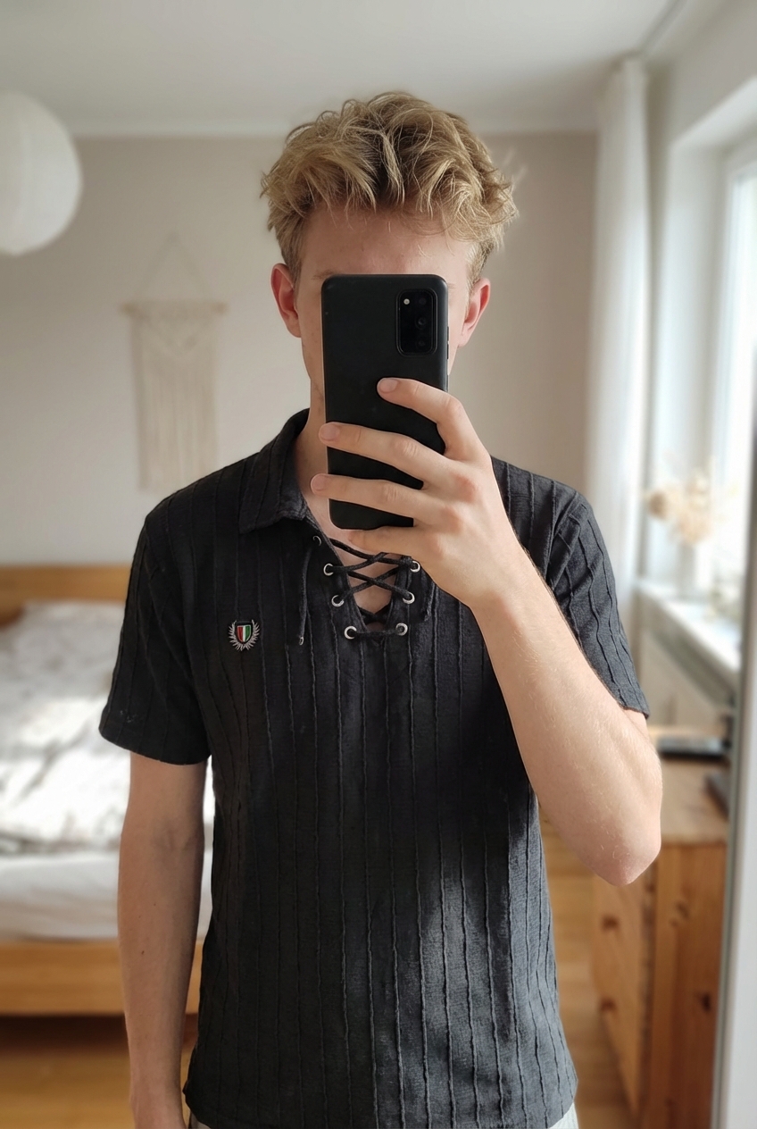 polo ITALIA debout, face à la caméra, dans une chambre à la lumière douce, avec une lumière naturelle filtrant par la fenêtre.