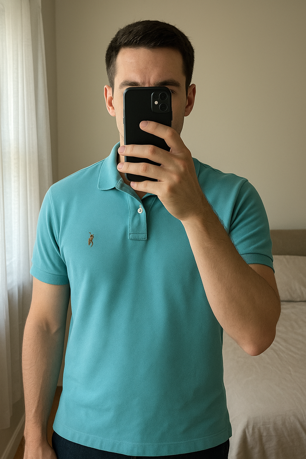 Polo Ralph Lauren bleu ciel turquoise taille XL debout, face à la caméra, dans une chambre à la lumière douce, avec une lumière naturelle filtrant par la fenêtre.