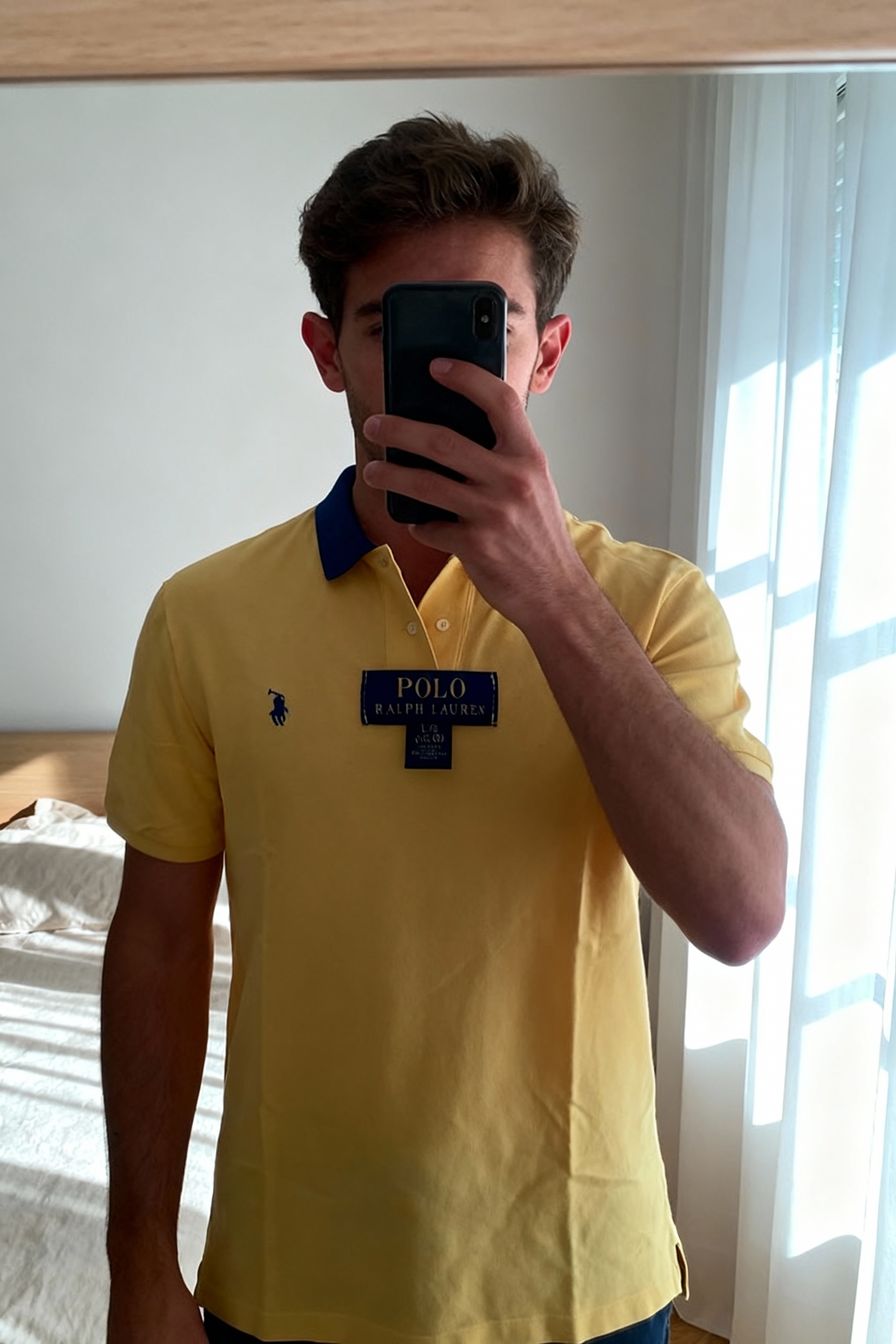 Polo Ralph Lauren jaune - S debout, face à la caméra, dans une chambre à la lumière douce, avec une lumière naturelle filtrant par la fenêtre.
