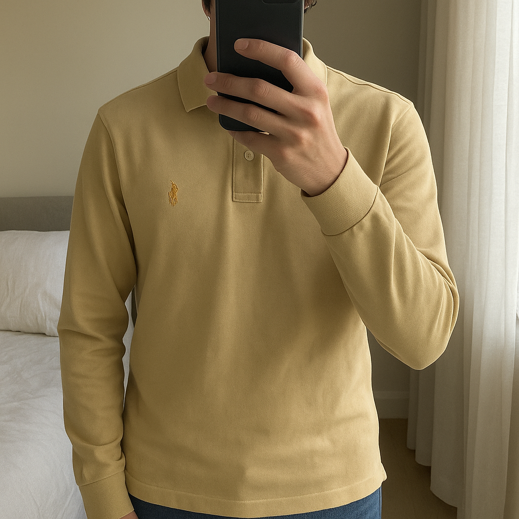 Polo Ralph manches longues debout, face à la caméra, dans une chambre à la lumière douce, avec une lumière naturelle filtrant par la fenêtre.