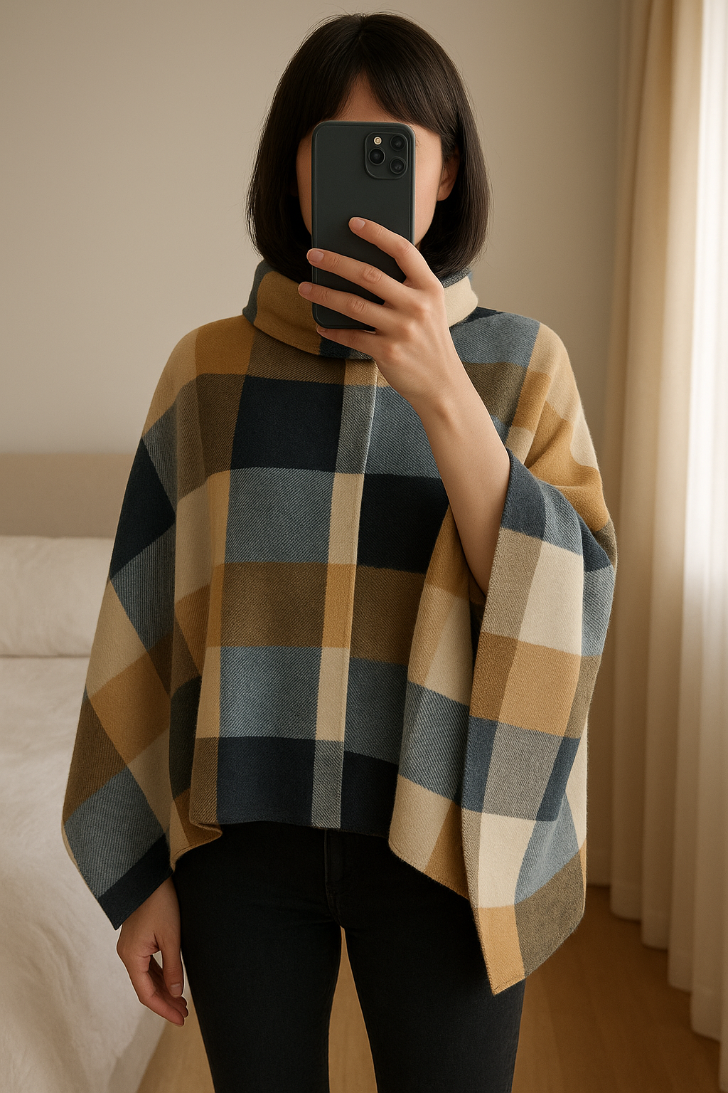 Poncho Plaid Polaire à Carreaux - Col Boutonné - Taille Unique 36/38/40 - Proche du Neuf debout, face à la caméra, dans une chambre à la lumière douce, avec une lumière naturelle filtrant par la fenêtre.