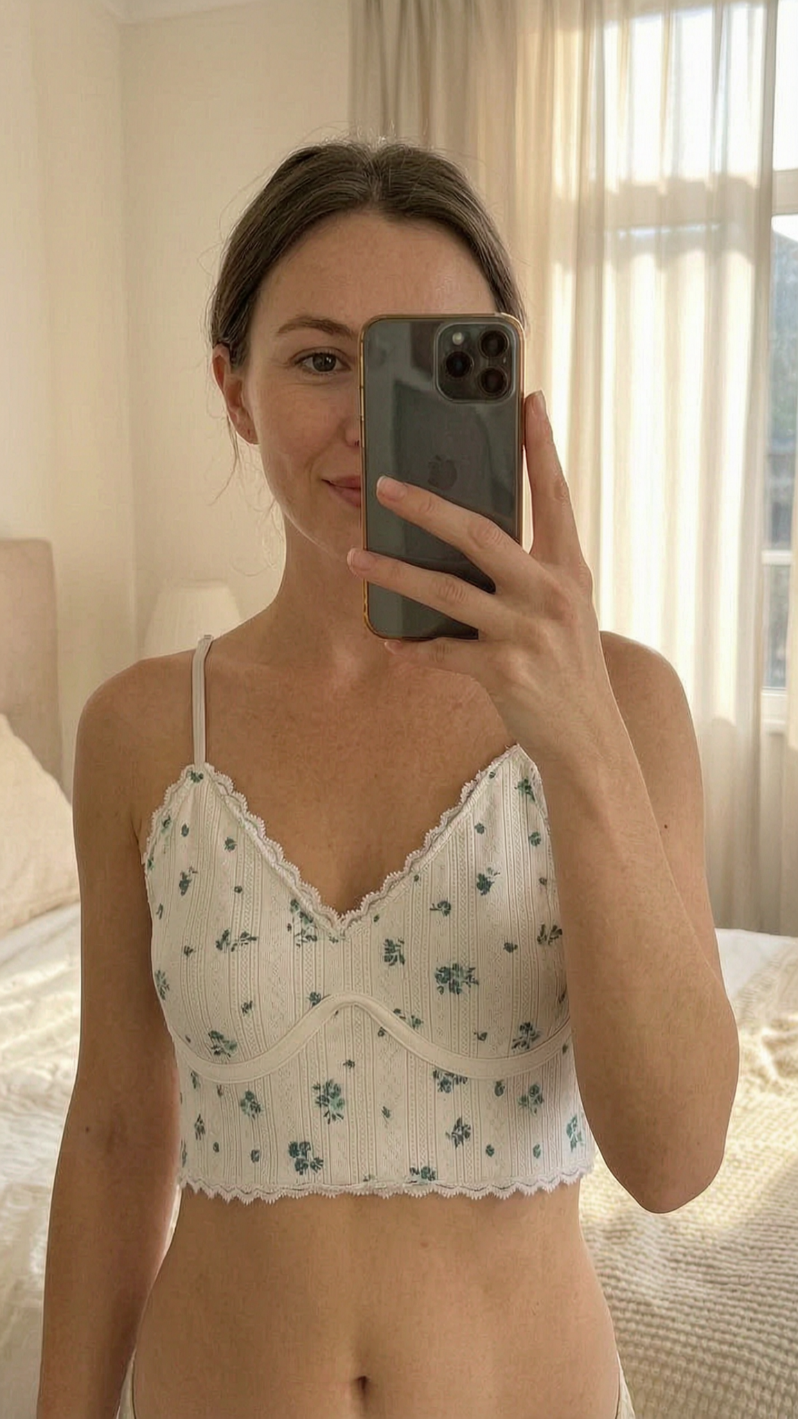Primark brassière blanche avec fleurs bleues vert debout, face à la caméra, dans une chambre à la lumière douce, avec une lumière naturelle filtrant par la fenêtre.