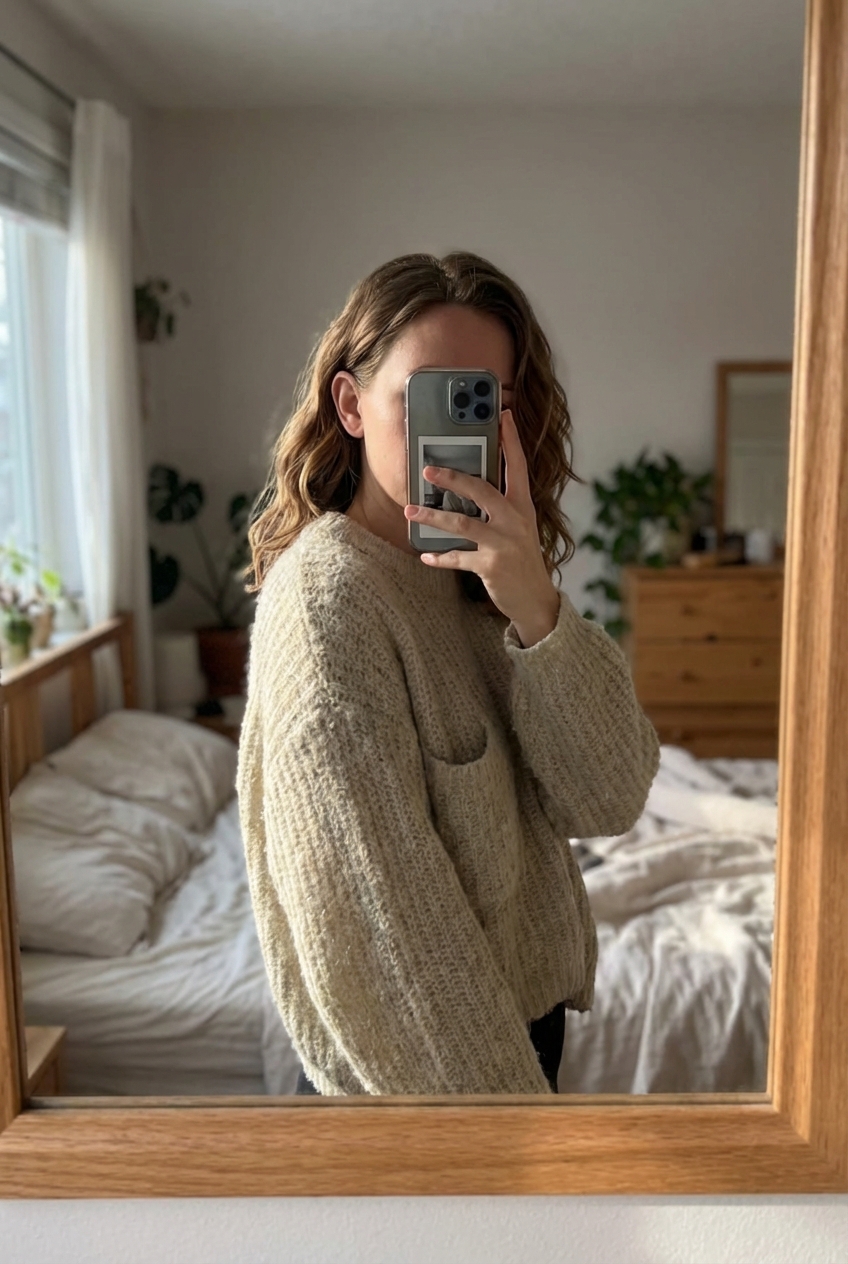 Pull American Vintage alpaga M - Maglione Donna American vintage M in piedi, rivolto verso la fotocamera, in una camera da letto con luce soffusa e luce naturale che filtra dalla finestra.