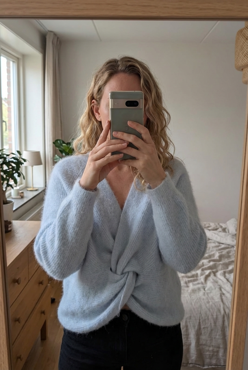 Pull bash bleu acier debout, face à la caméra, dans une chambre à la lumière douce, avec une lumière naturelle filtrant par la fenêtre.