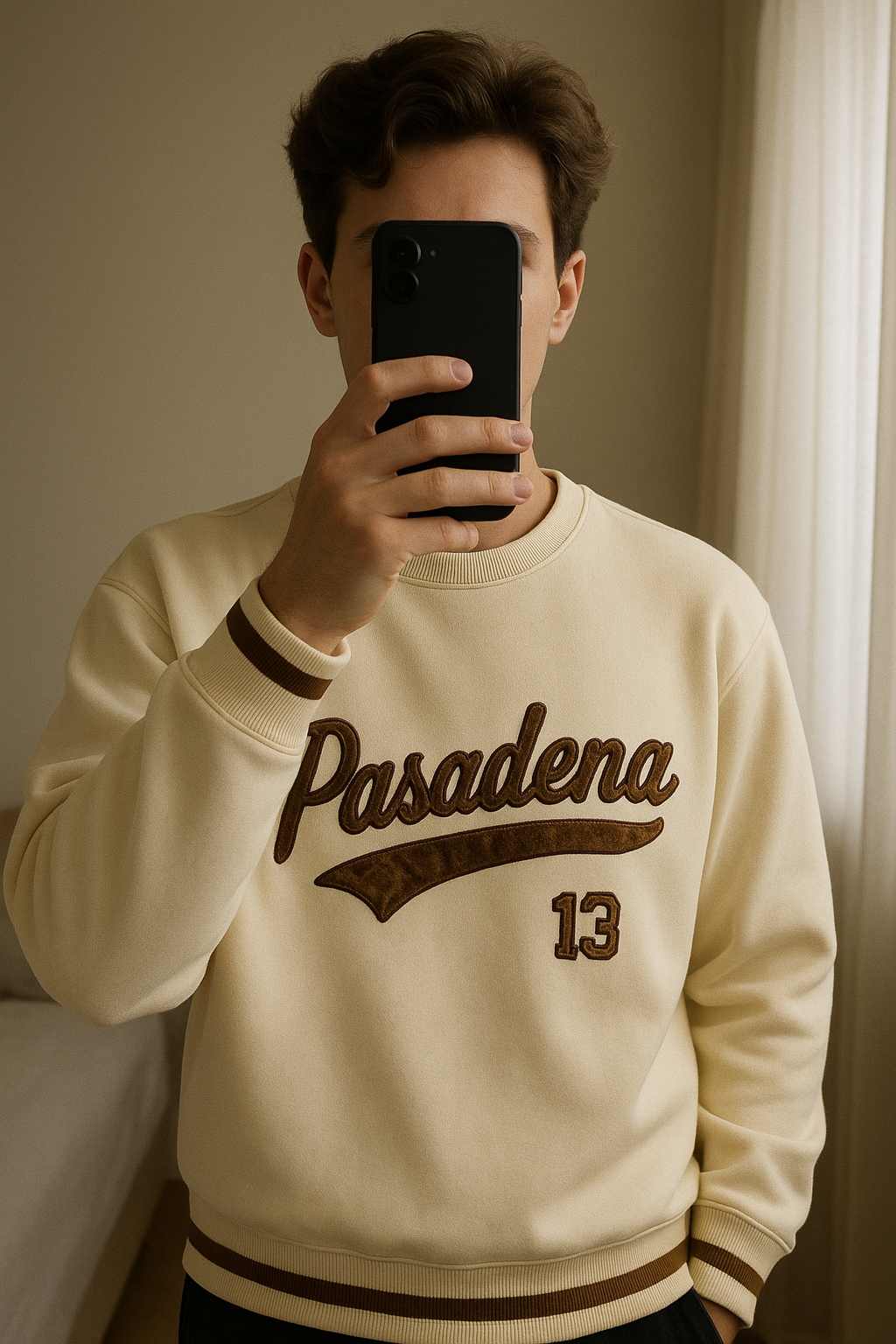 Pull&bear pulcsi standing straight facing the camera, in a softly lit bedroom setting, with gentle natural light filtering through a window.