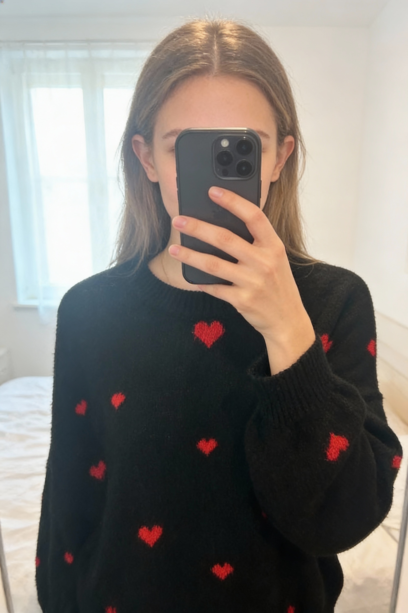 Pull à cœur debout, face à la caméra, dans une chambre à la lumière douce, avec une lumière naturelle filtrant par la fenêtre.