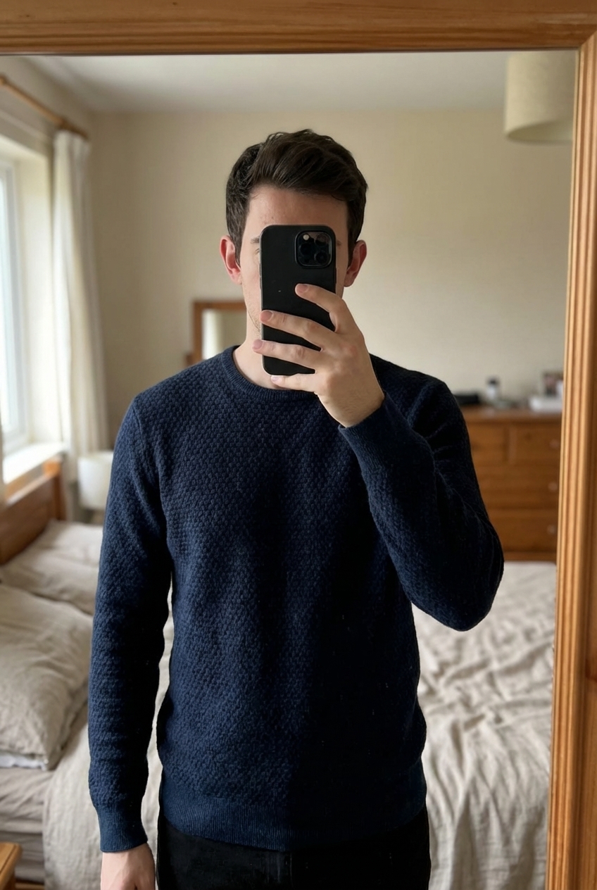 Pull Calvin Klein Homme Taille M en Laine debout, face à la caméra, dans une chambre à la lumière douce, avec une lumière naturelle filtrant par la fenêtre.