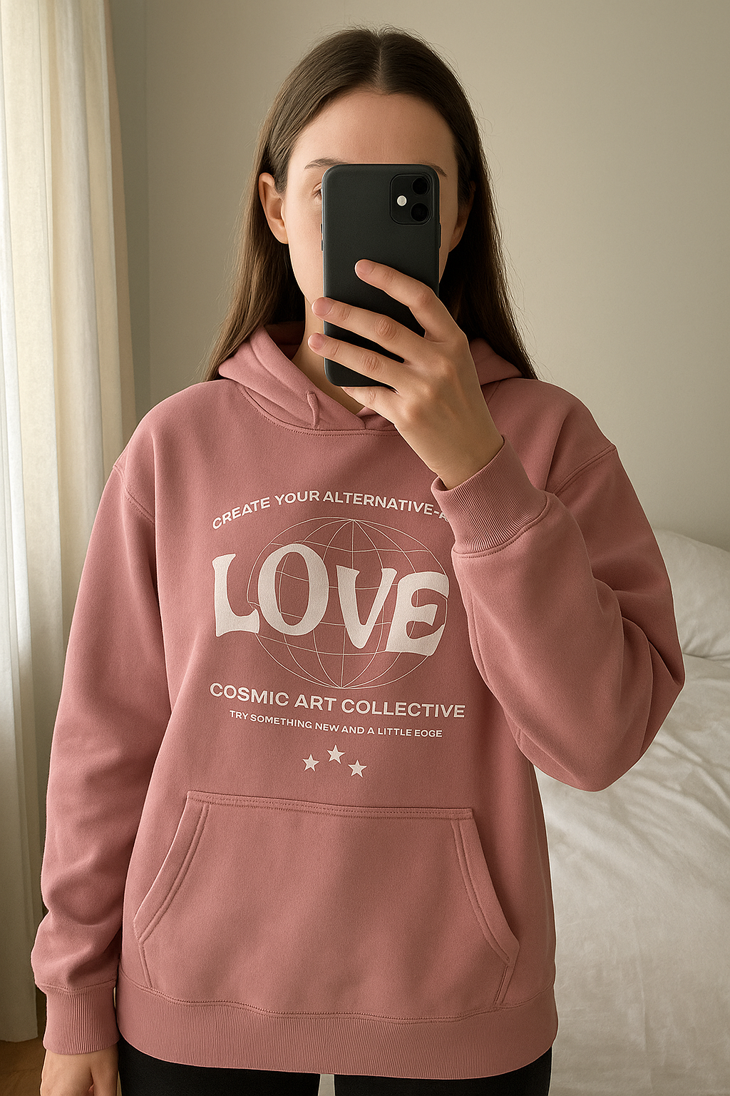 Pull à capuche debout, face à la caméra, dans une chambre à la lumière douce, avec une lumière naturelle filtrant par la fenêtre.