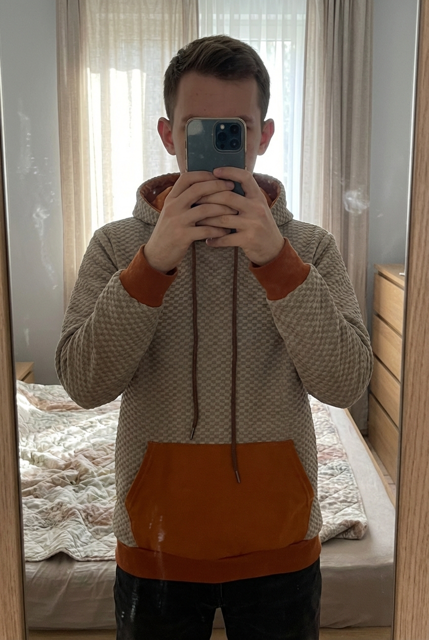 Pull à capuche et poche debout, face à la caméra, dans une chambre à la lumière douce, avec une lumière naturelle filtrant par la fenêtre.