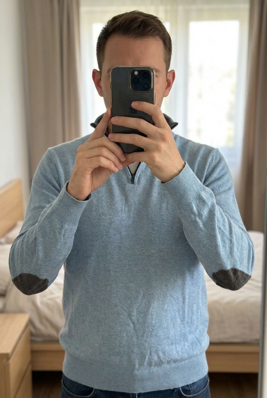 Pull celio col debout, face à la caméra, dans une chambre à la lumière douce, avec une lumière naturelle filtrant par la fenêtre.