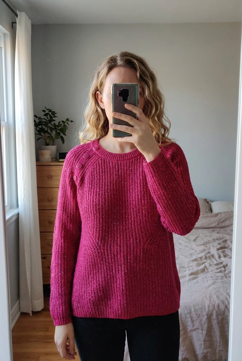 Pull chaud debout, face à la caméra, dans une chambre à la lumière douce, avec une lumière naturelle filtrant par la fenêtre.
