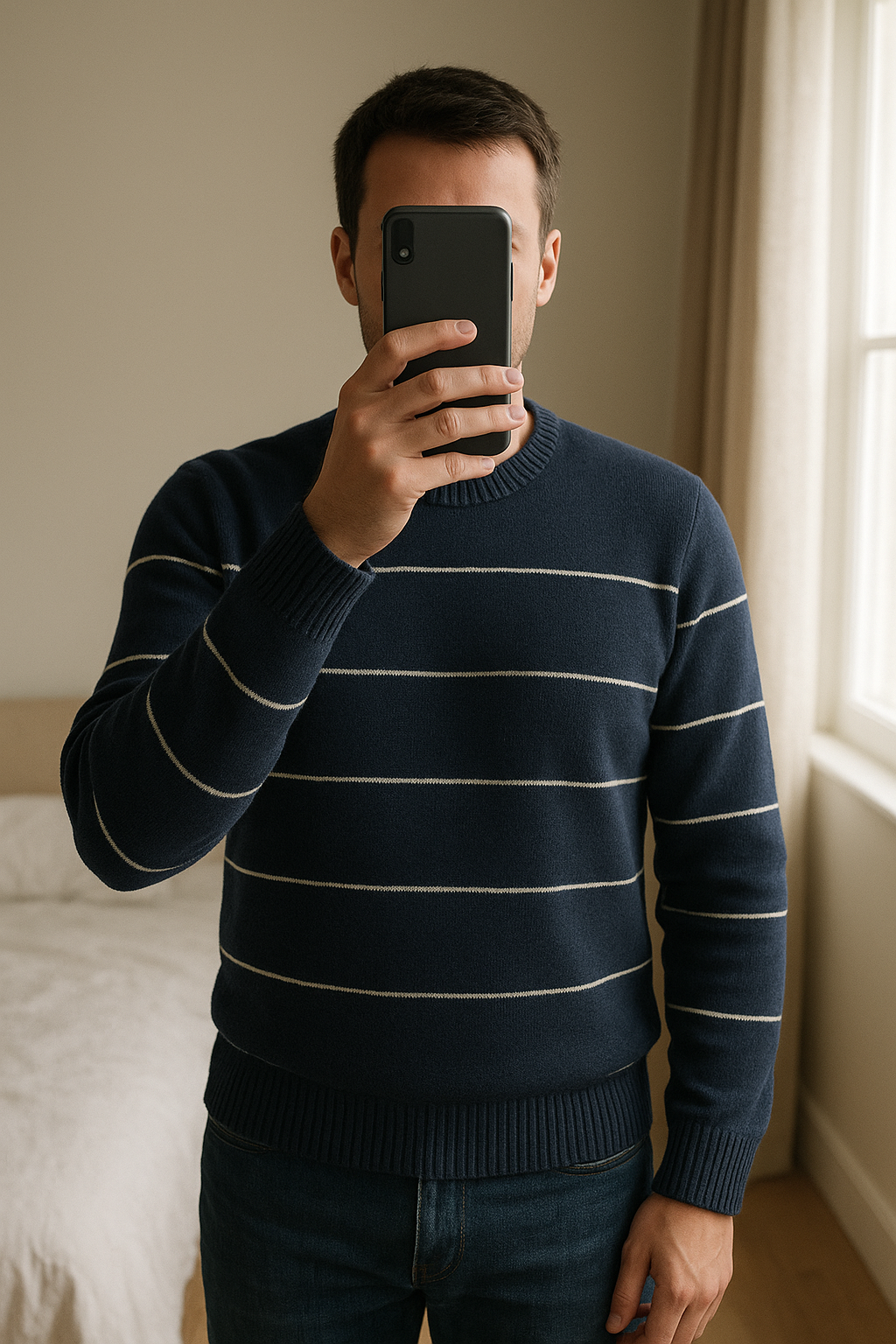 Pull Col Rond Tommy Hilfiger 100% coton Bleu Marine XL debout, face à la caméra, dans une chambre à la lumière douce, avec une lumière naturelle filtrant par la fenêtre.