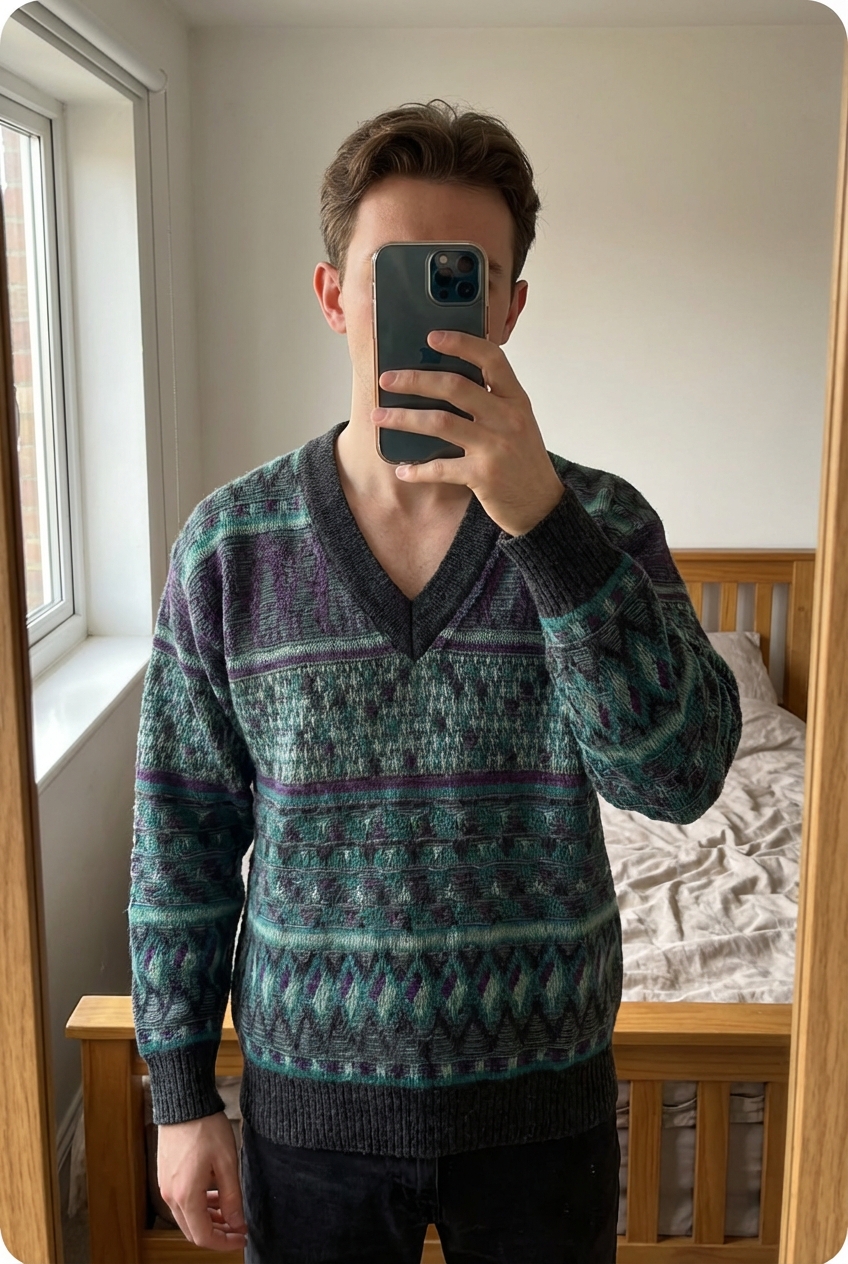 Pull Col v 90's Sweater à motif athenic patern Vintage Made in Italy En Laine gris L debout, face à la caméra, dans une chambre à la lumière douce, avec une lumière naturelle filtrant par la fenêtre.
